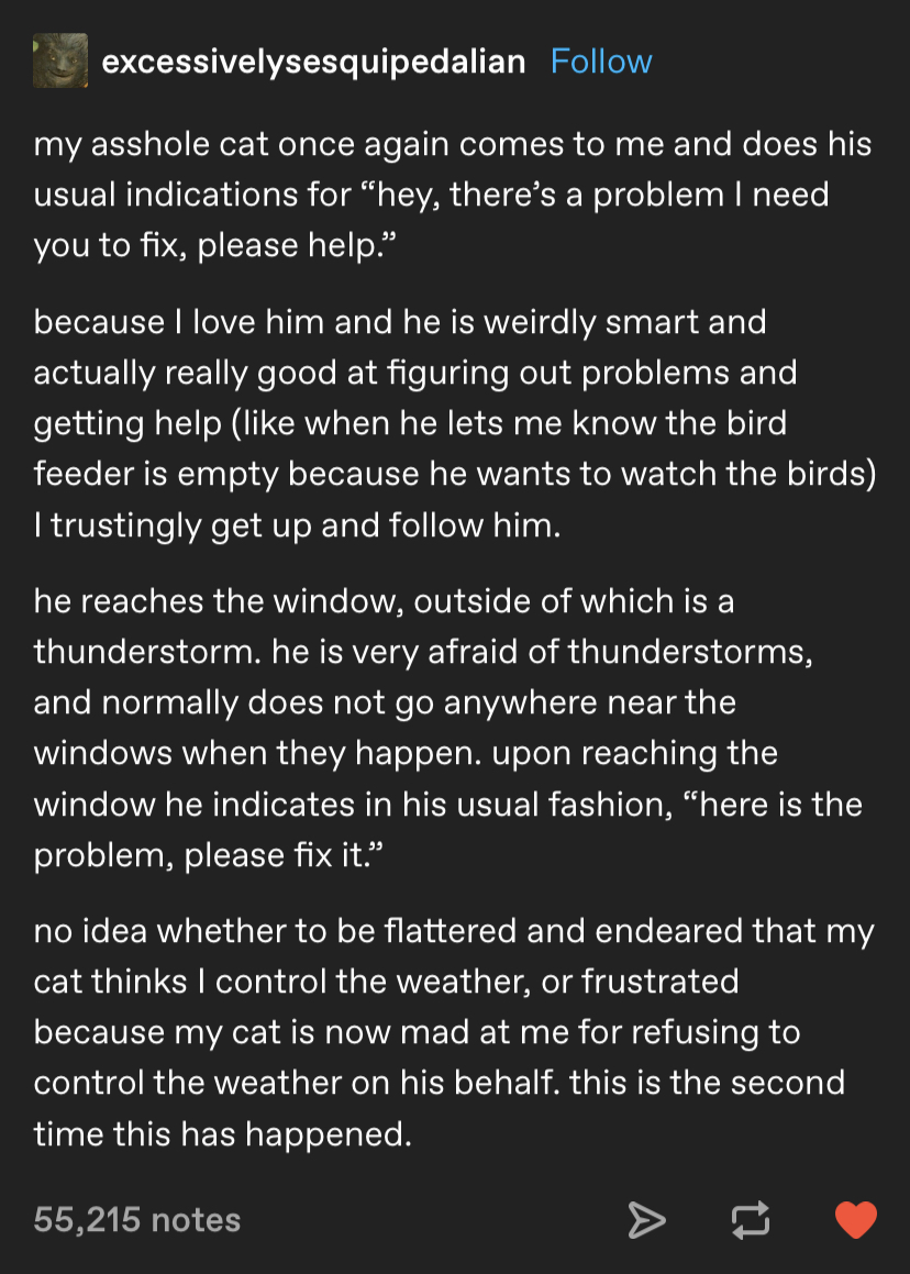 That does not sound like an asshole cat. This sounds like a perfectly nice cat in need of some away-from-the-window lap snuggles during thunderstorms!