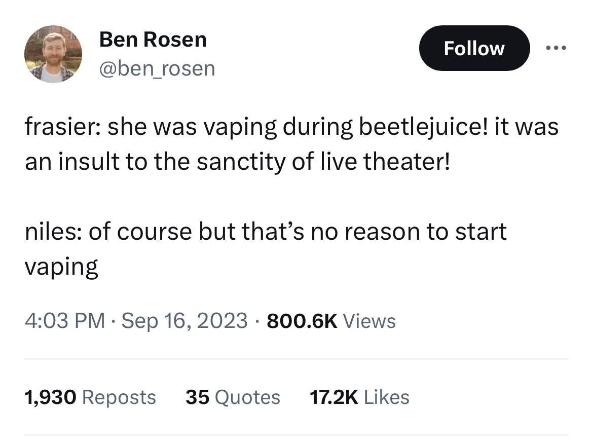 Frasier says, presumably about the petulant teenage wet dream of a controversy involving the inept politician Lauren Boebert, “she was vaping during Beetlejuice! It was an insult to the sanctity of live theater!”