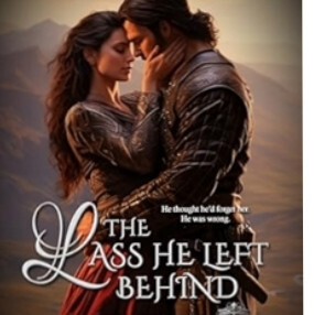 A romance novel cover showing a man in a leather jerkin (I think?) holding a woman in an old-fashioned dress. It's entitled "The Lass He Left Behind", only the "L" in "Lass"—and no other letter—is swirly and looks like it might be a curlicue unrelated to the title.