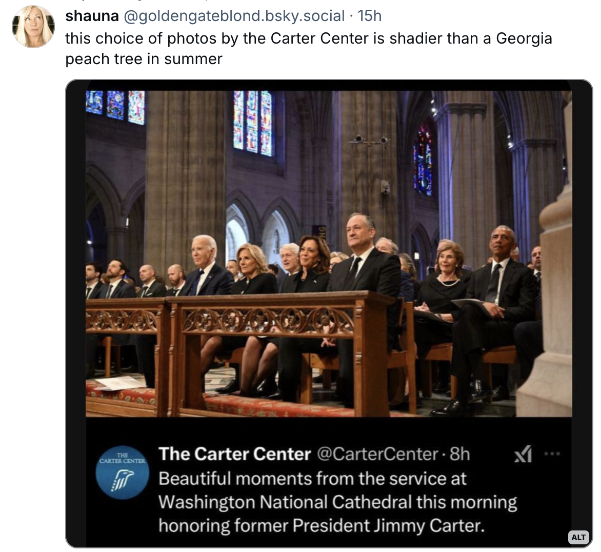 Bsky screenshot from shauna (@goldengateblond.bsky.social), saying "this choice of photos by the Carter Center is shadier than a Georgia peach tree in summer"