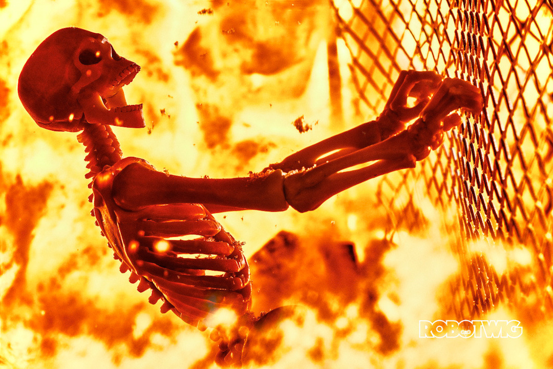 A skeleton figure in flames, reaching out and grasping wire mesh. The skeleton appears to be partially burned, with its skull, ribcage, and arms visible against a backdrop of intense orange and yellow fire. The image has a dramatic, fiery atmosphere with embers and flames surrounding the skeleton. In the bottom right corner, there's a "ROBOTWIG" watermark or logo. The overall aesthetic is dark, intense, and evocative of destruction or torment.