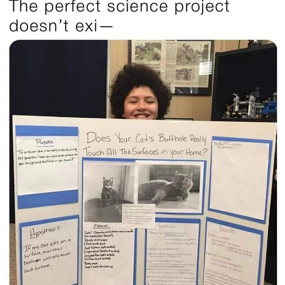 followed by a photo of a child at a school science fair with a three panel poster for their experiment titled "Does your cat's butthole really touch all the surfaces in your home?" followed by two photos of a cat, and some statements about the project that are illegible