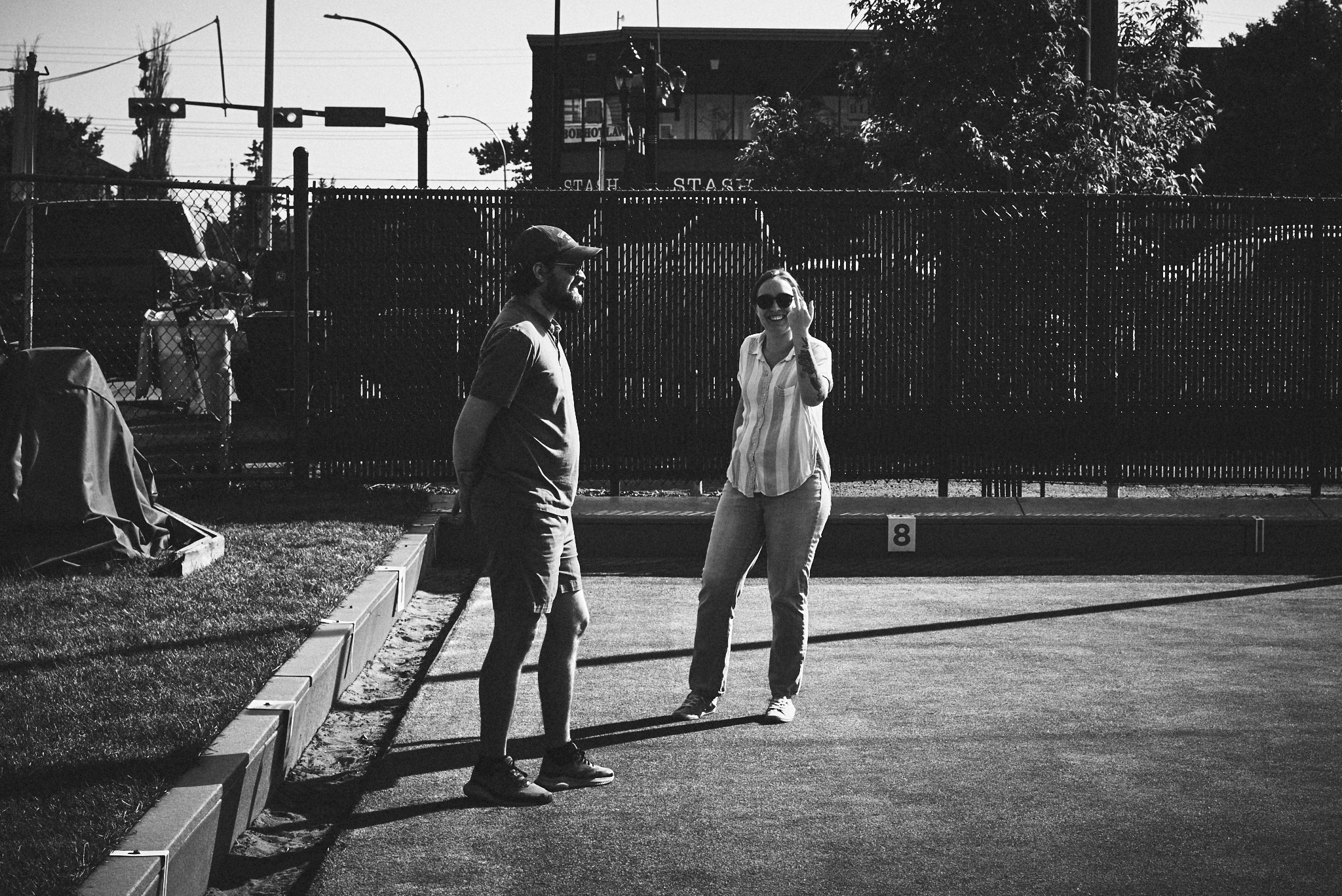 A black and white photograph of two incredibly attractive people on a lawn bowling pitch. One of them is flipping off the camera and smiling. The other is staring pensively into the distance.