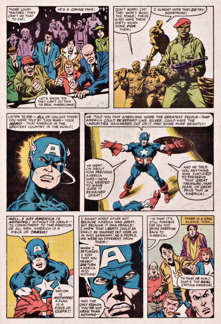 Six seven planels of a comic book—in the first, a mob of regular people and a group of armed soldiers are contemplating rushing Captain America, who then delivers an angry but patriotic speech.