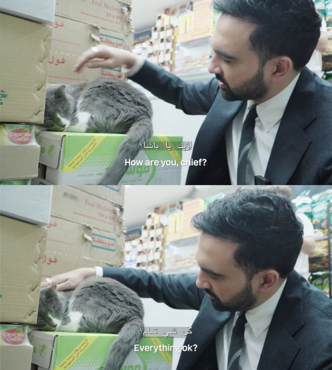 Someone on Bluesky said that he's speaking Syrian Arabic (which clocks; his wife is Syrian) except when talking to the cat, when he switches to Egyptian Arabic (which clocks, because that is where the cat was worshipped as a god).