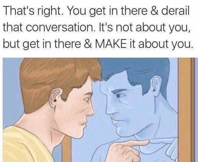 A cartoon illustration shows a man standing close to a mirror, leaning in and pointing at his own reflection. The reflected version of himself appears more serious and confident. Above the image, white text reads: “That’s right. You get in there & derail that conversation. It’s not about you, but get in there & MAKE it about you.” The meme humorously mocks self-absorbed behavior and people who make every situation about themselves.
