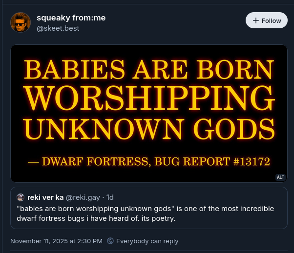 In wiki form (organized, easier to read, but can't be mindlessly scrolled forever): https://dwarffortresswiki.org/index...