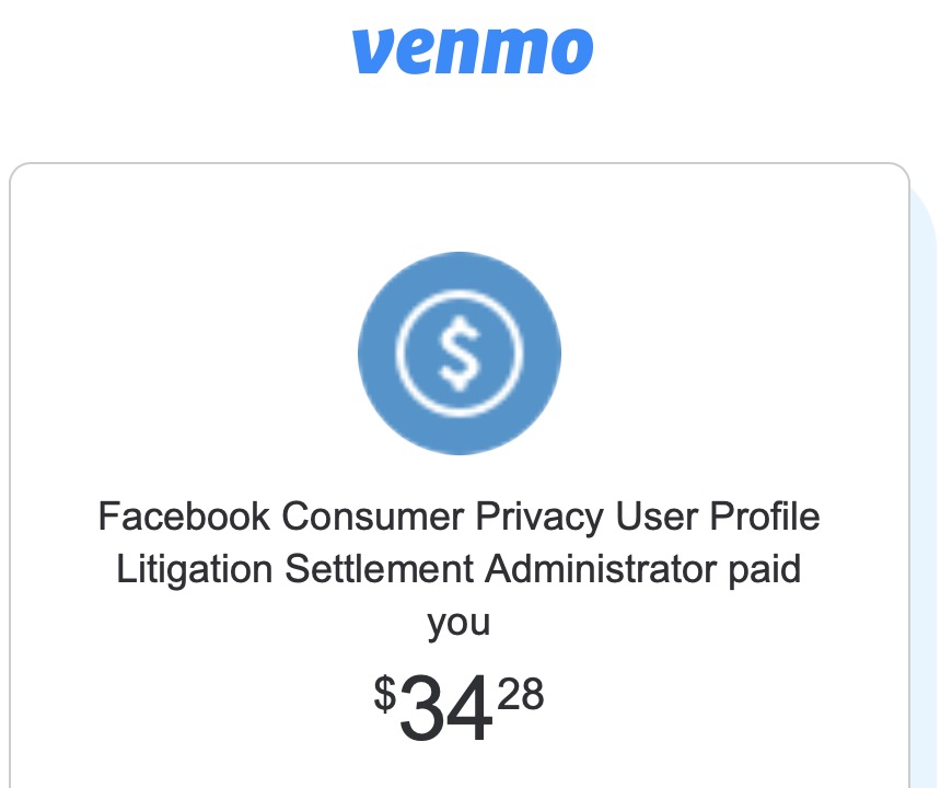 @bencmeissner No. There was a sketchy thing about getting the payment though. There weren't any notes about it in any of the emails received from the Facebook lawyers (all of which looked like spam from 1998). I got an email that I was being paid by Venmo, but the money didn't show up, I did some research and for no reason I can understand in a connection between the settlement and Venmo, I had to request a verification of my email address from my Venmo account itself. 30 seconds later I got the payment.