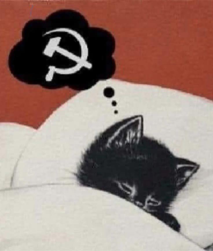 Illustration of a kitten sleeping in bed, it's eyes are closed above it is a small think bubble with a hammer and sickle inside, indicating the cat is dreaming of communism.