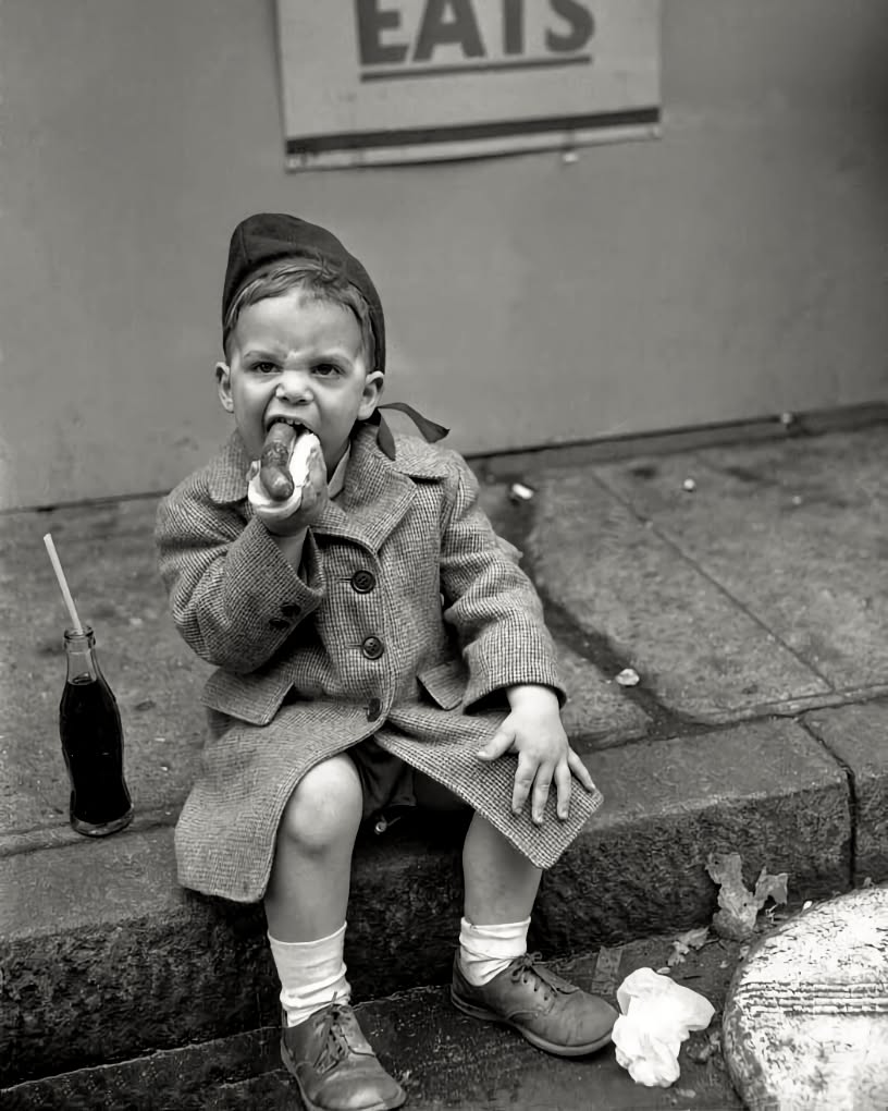 Boy eating hotdog, Manhattan, ca. 1950 - by Nat Fein (1914 - 2000), American.