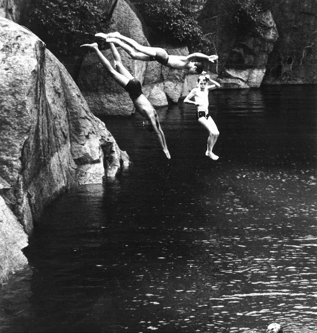 black and white photo of three boys airborne on their way to the water filling the bottom of a quarry