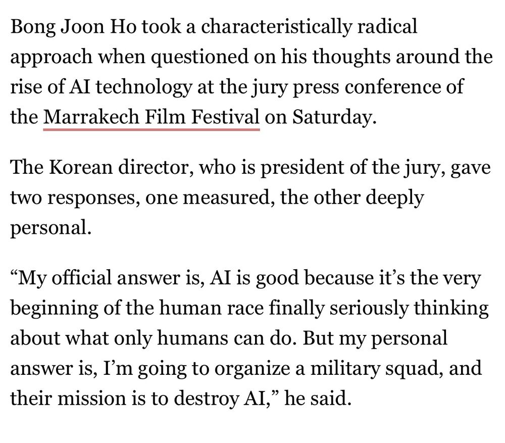 Bong Joon Ho took a characteristically radical approach when questioned on his thoughts around the rise of AI technology at the jury press conference of the Marrakech Film Festival on Saturday.