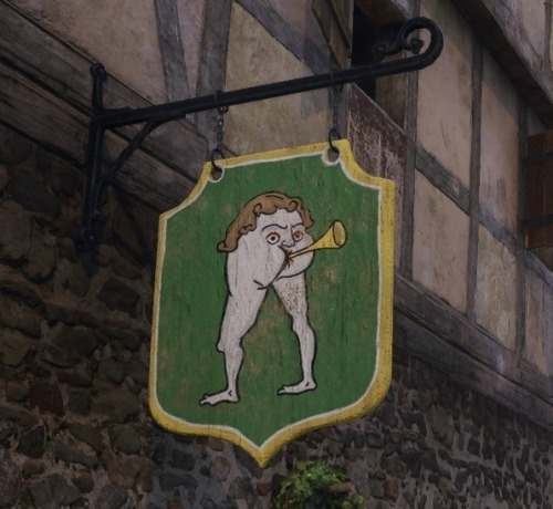 A hanging pub sign, featuring a drawing of a pair of legs with a trumpet sticking out of the ass, the ass being also the face of the figure.