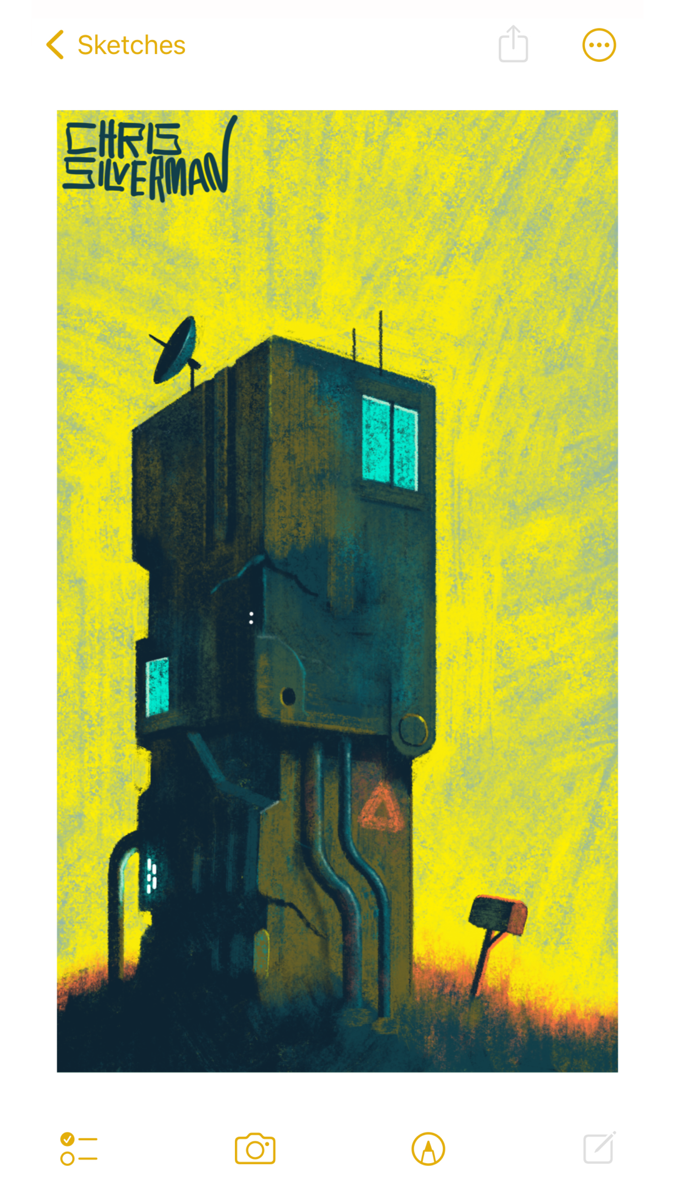 A strange, heavily industrial building stands against a yellow sky. The building is tall—think of two differently-sized file cabinets stacked on each other—and looks more like a machine part or piece of equipment than a dwelling. It is a drab dark gray with a brownish tinge that suggests weathered concrete. The sides have numerous odd crevices, pipes, and striations, with a red triangle that suggests a hazard symbol painted on the right side. It has a few small windows that reveal a blue interior, as well as glowing white LED-esque lights embedded in the side. On the roof are a few antennas and a radio dish. Out front is a small mailbox. The grass around the building is tinged red from the sun. The painting is signed "Chris Silverman".