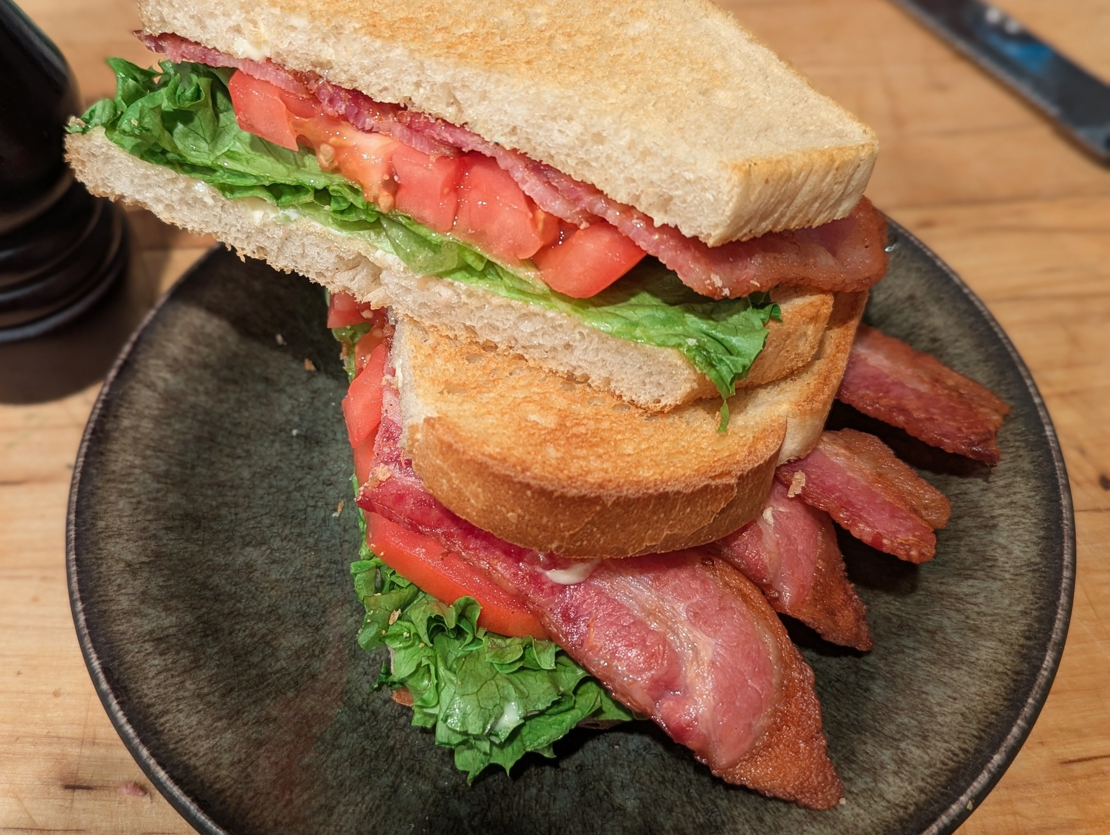 Toasted up some sourdough, grabbed a pack of precut thick slice bacon, a tomato from the loose bin and some lettuce. A quick toast, smear of kewpie mayo on insides, 2 slices of tomato and some leaves of green lettuce. Air fried up 4 strips and got them just crispy and chewy enough.