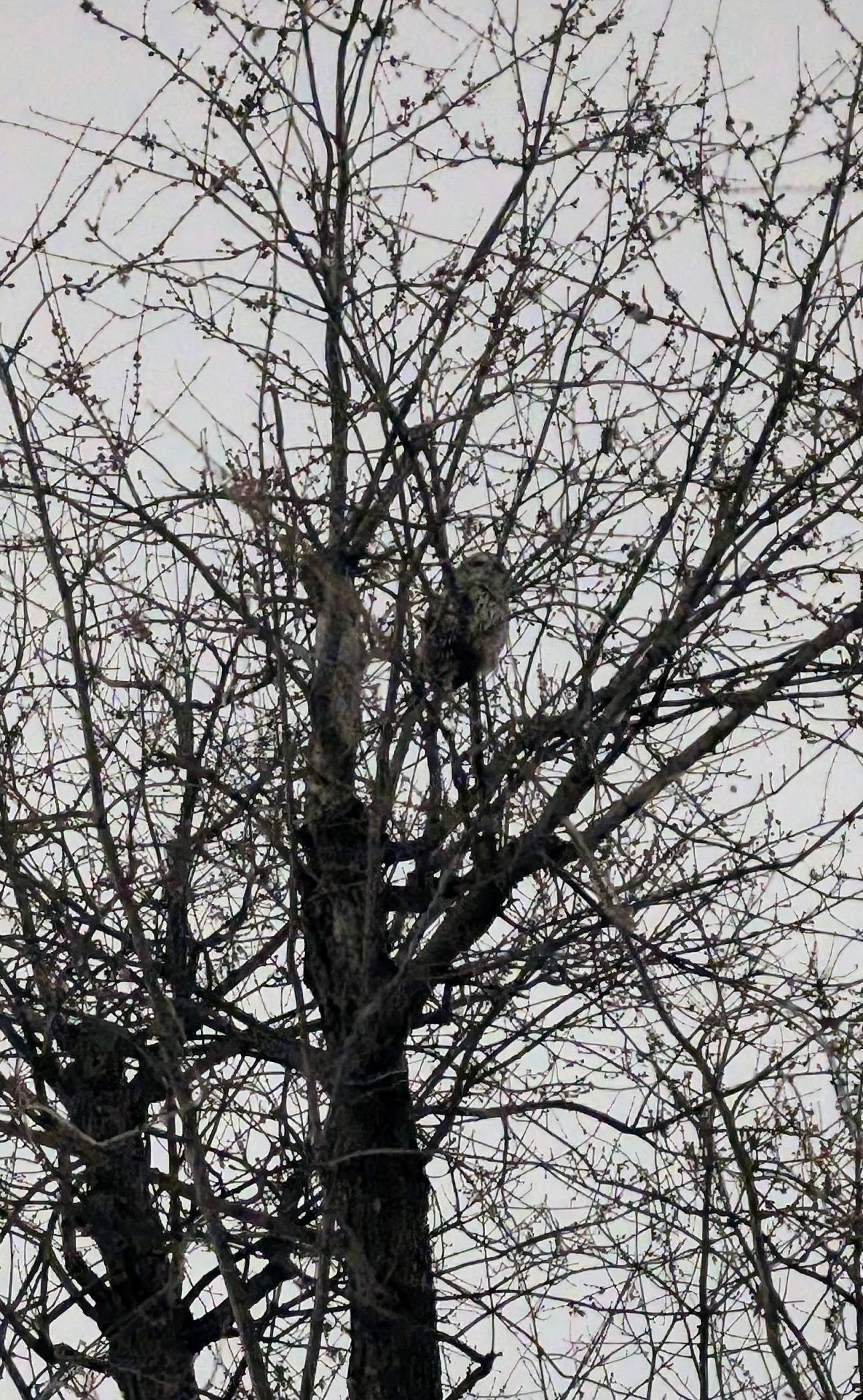 Reasonably decent picture of a Barred Owl perched in a mostly bare tree on an overcast Winter night.