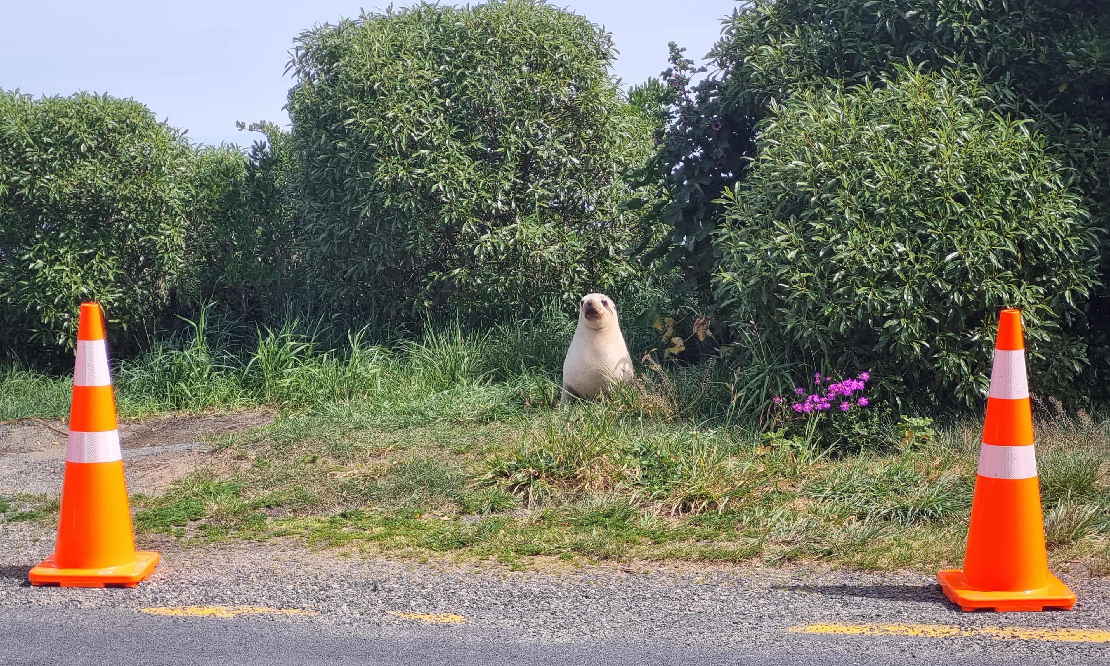 "A sea lion looks out between two road cones on a road near Dunedin. Photograph: Giverny Forbes/Department of Conservation"