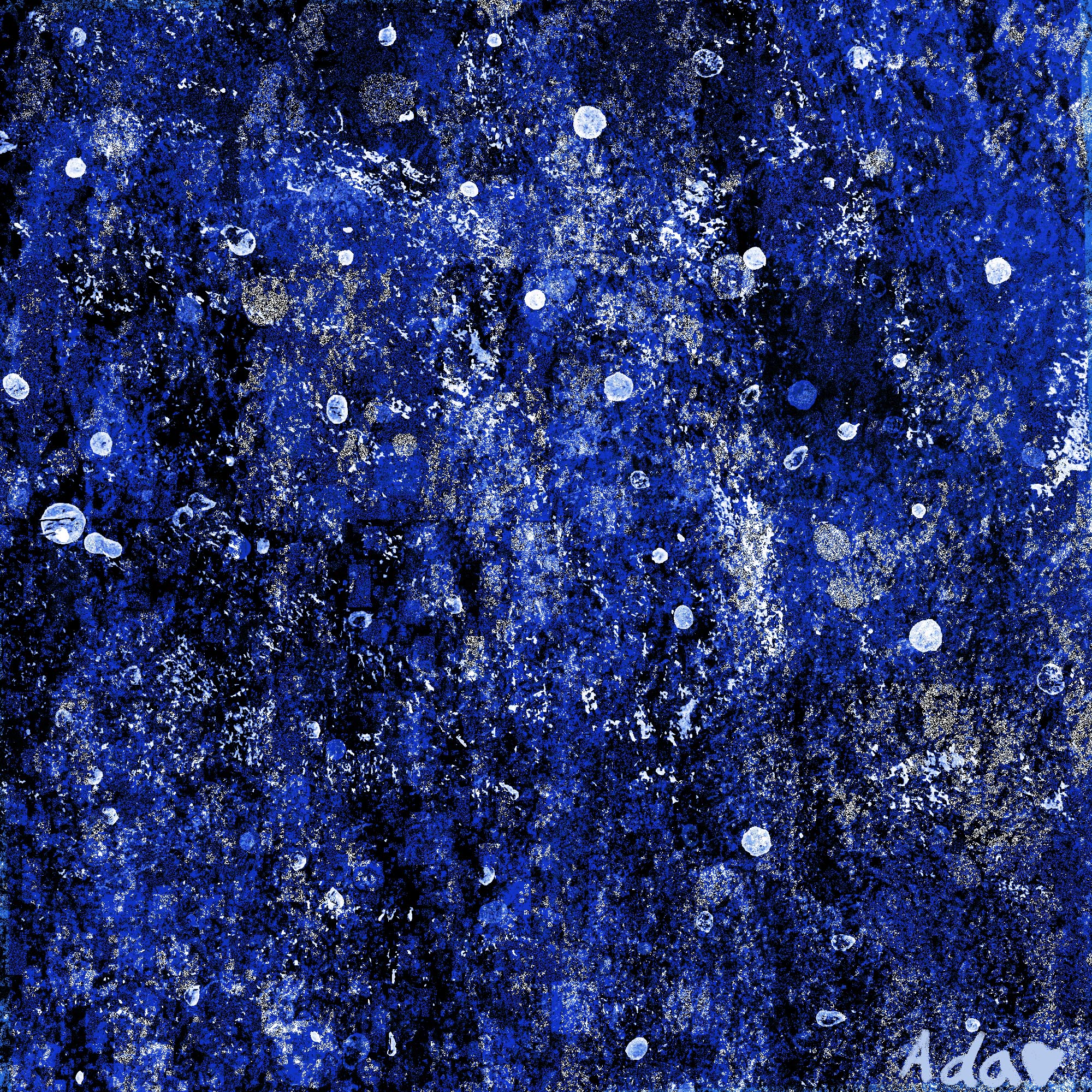An oil pastel and digital painting, mostly deep blues and black, with splattery splots of white, kind of evokes a snow storm.