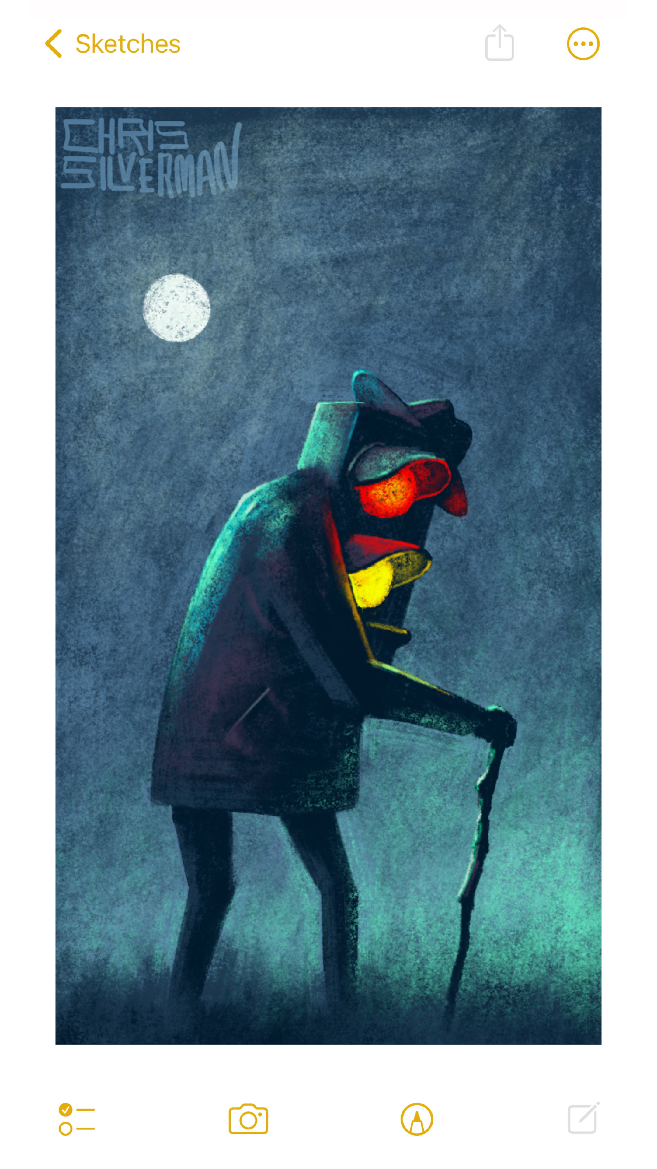 A hunched figure wearing a coat and a hat walks under a gray night sky and a slightly hazy full moon. The figure has a gnarled cane, and might look like an elderly person out for a walk if it weren't for the fact that its entire upper body is a traffic signal, the red and yellow lights blazing. A low fog hangs over the ground. The painting is signed "Chris Silverman".
