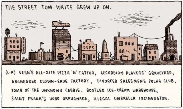 Single-panel cartoon, showing a dingy old-fashioned city block. "The street Tom Waits grew up on: (l-r) Vern's All-Nite Pizza 'n' Tattoo, accordion players' graveyard, abandoned clown-shoe factory, divorced salesmen's polka club, Tomb of the Unknown Cabbie, bootleg ice-cream warehouse, Saint Frank's hobo orphanage, illegal umbrella incinerator."