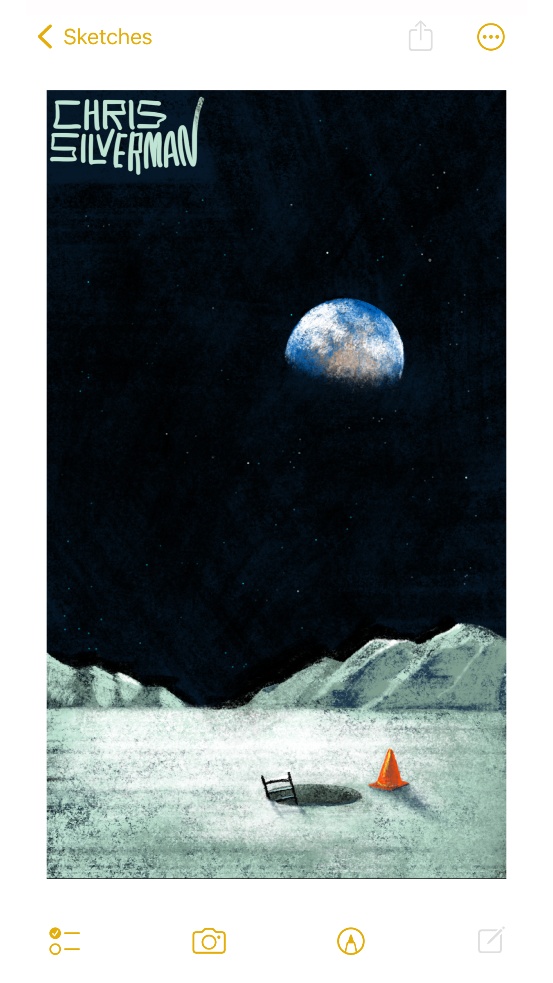A view from the surface of the moon: a vast white expanse under a starry black sky. In the top right of the sky sits the earth, a blue and brown half-moon covered with white clouds. Visible in the distance are mountains. Closer to the viewer is a round hole in the ground. A ladder is sticking out of it, leading down to who knows where. Next to the hole is an orange warning cone. The painting is signed "Chris Silverman".