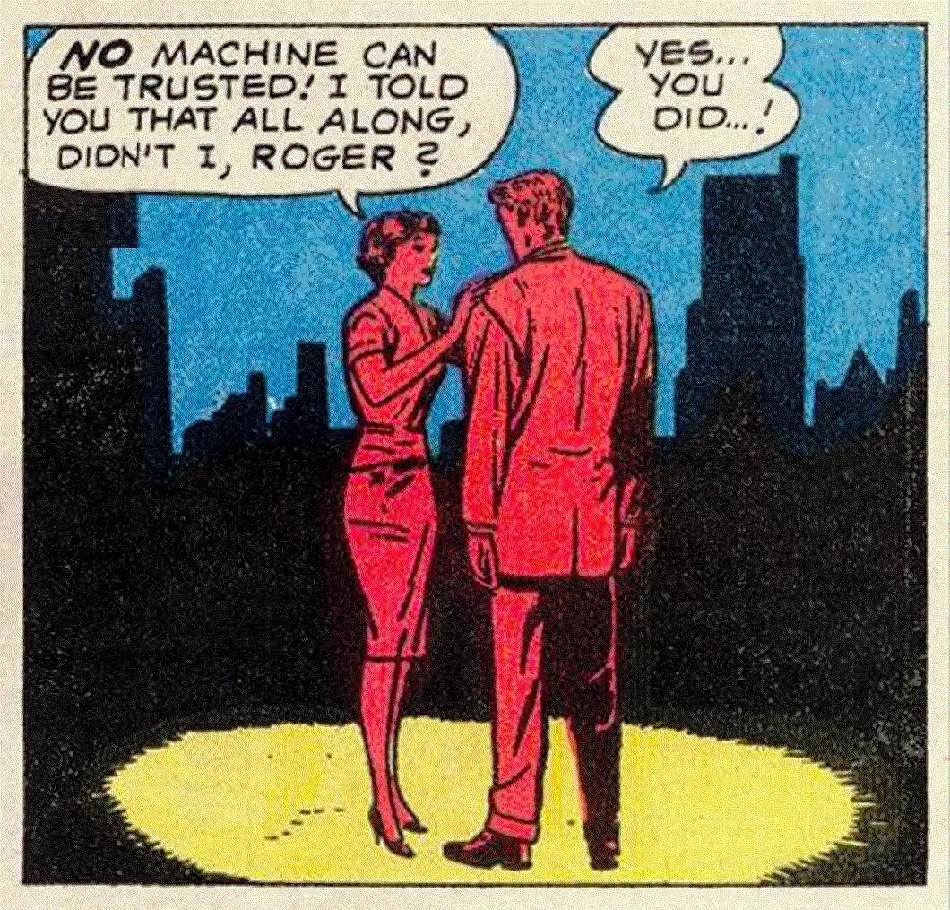 comic panel: a man and a woman stand in a spotlight with a city skyline behind them. The woman says," NO machine can be trusted! I told you that all along, didn't I, Roger?" The man responds, "Yes... you did...!"