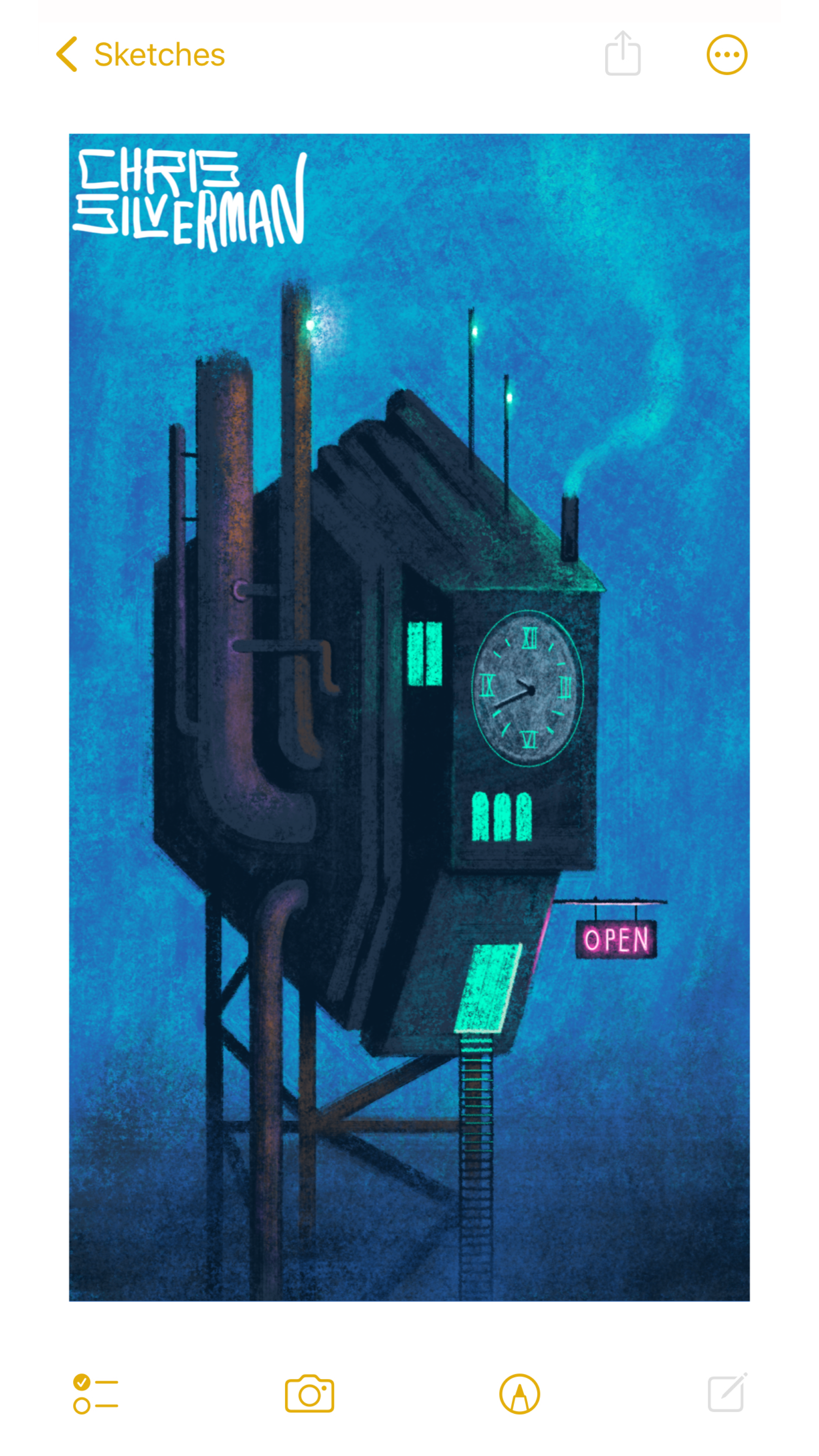 A large, strangely shaped building stands against a dark blue evening sky. It is the size of a house and shaped like a chunk of coal. It's dark like coal, too, and sits on a lattice of iron beams like a fire tower. Large rusty pipes are sticking out of one side of it, and several walls have small glowing green windows. On the front face of the building is a giant clock with green Roman numerals, set to 9:41. Two antennae stick out of the roof, with white lights on them. There is a small chimney, with smoke curling out of it. At the very bottom of the building is an open doorway, glowing green. A ladder extends down from the doorway, disappearing into the fog below. Hanging next to the doorway is a pink neon sign that reads "Open". The painting is signed "Chris Silverman".