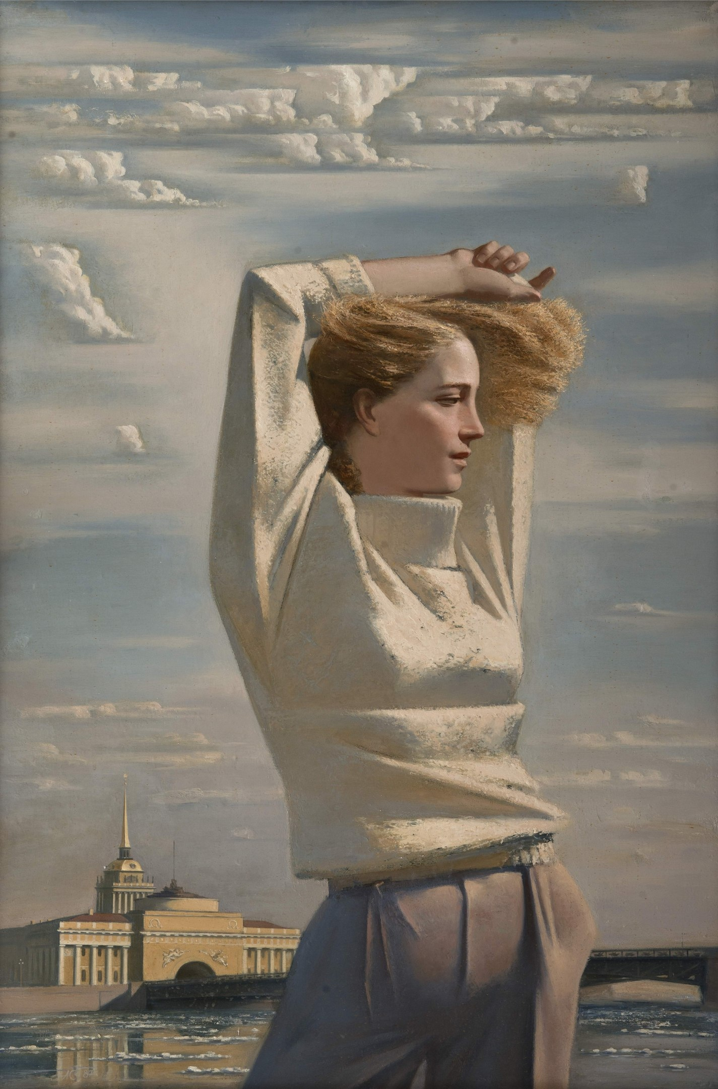 Painting of a woman wearing a white cashmere wool turtleneck sweater and gray slacks standing by the River Neva with the Winter Palace sitting in the background on the opposite shore. Her elbows are raised forming a rough rectangle, she's simultaneously all angles and yet soft due to the fabric of her clothes. Her hair is blowing in the wind. It must be very early spring, the sky is cloudy and the wind seems high, there's little caps of ice in the river.