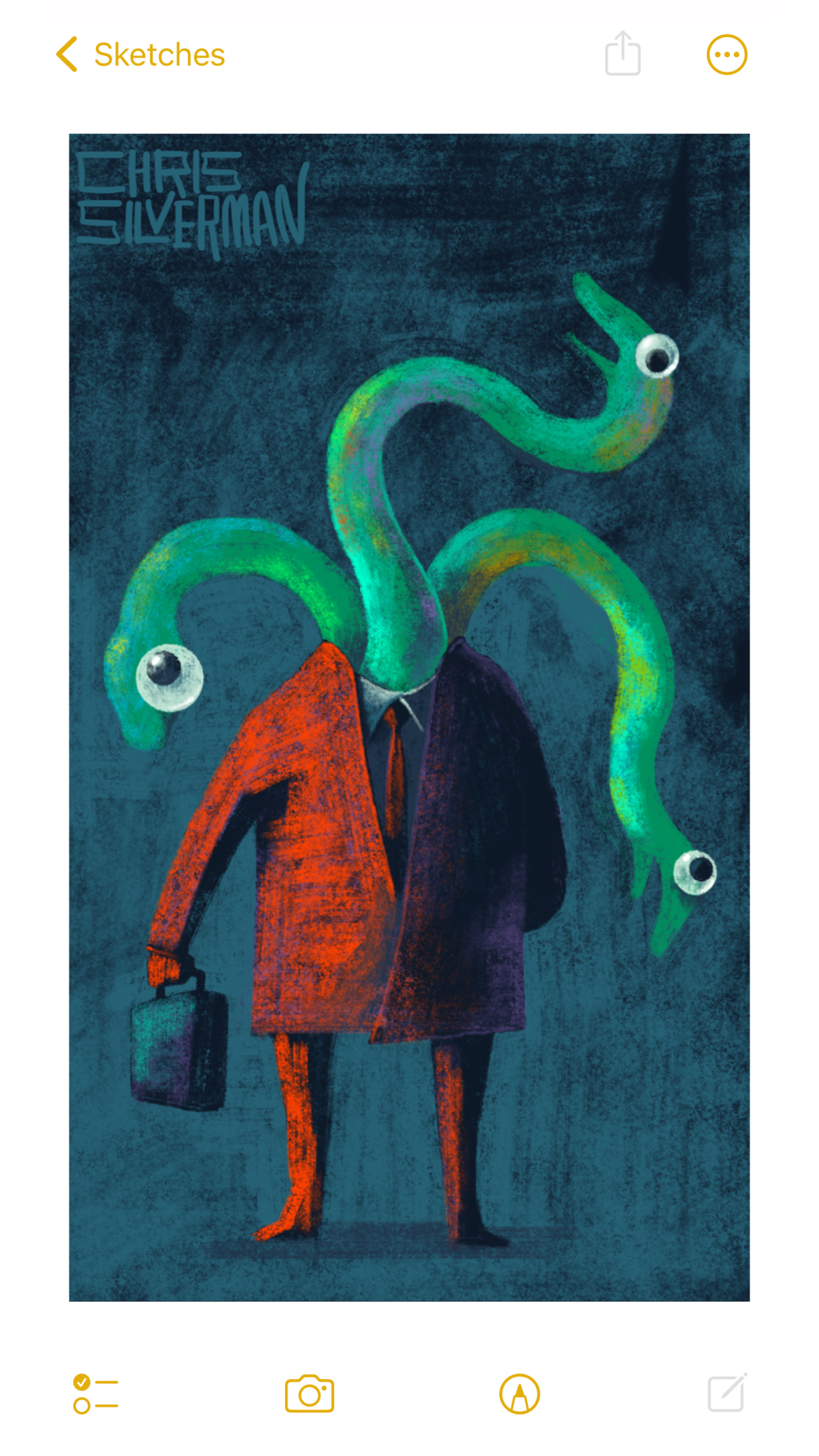 A figure stands in a bleak blue space wearing a bright red suit and tie. The figure's left hand is behind its back, while its right holds a small dull-green suitcase. Where the figure's head should be are three long, powerful serpents. Each one has a haphazardly placed googly eye on its head. The painting is signed "Chris Silverman".