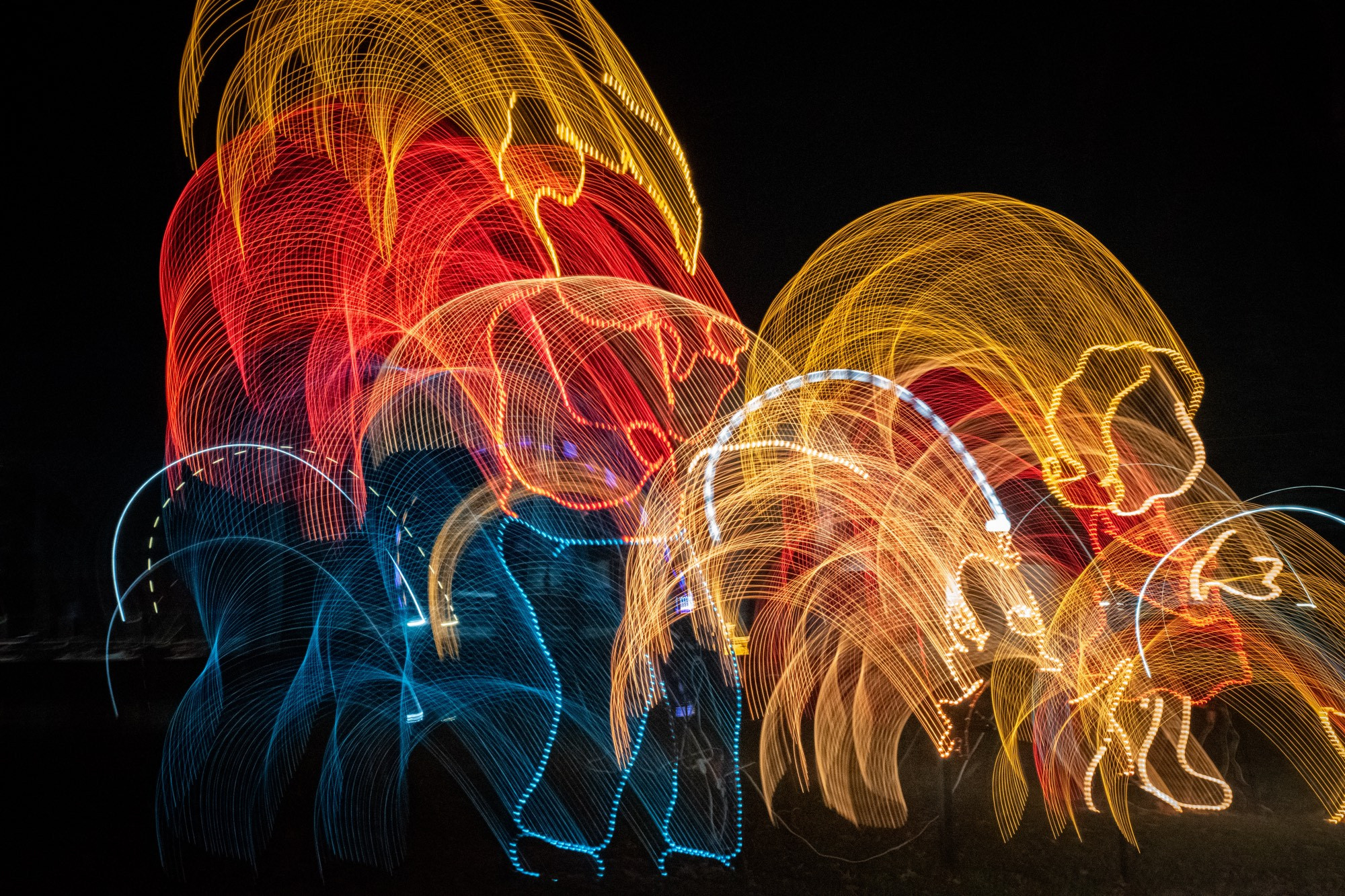 "A photo of light trails from the window of a car while we drove around the Parkerburg, West Virginia City Park light display. I think this is a kid fishing, but there are several lights out & admittedly it sort of looks like the kid is peeing into the fishes mouth."