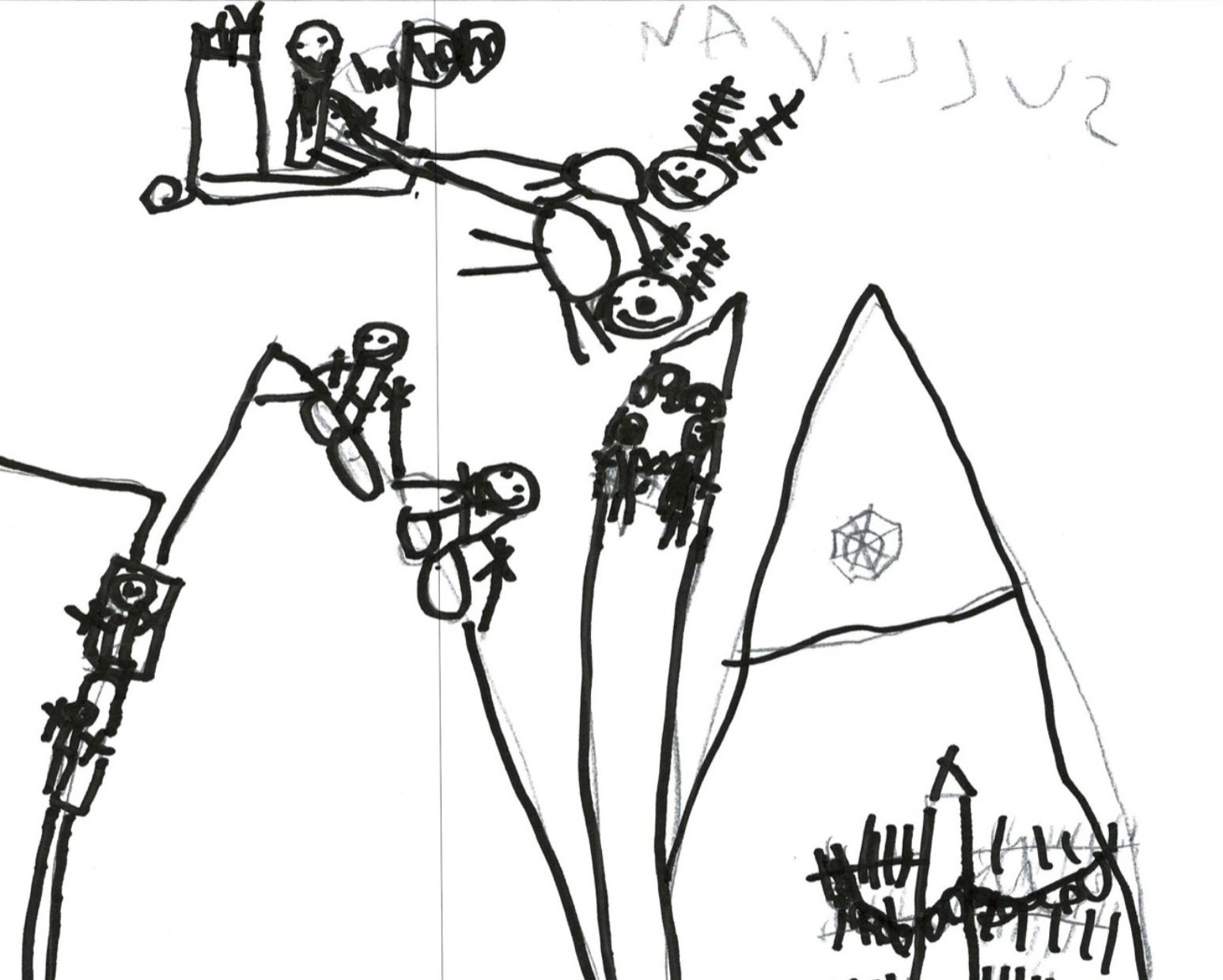 a child's drawing of a santa and reindeer flying over a mountain where people are skiing. Everyone is a smiling stick figure and they all have those hands which is just lines projecting out in all directions.