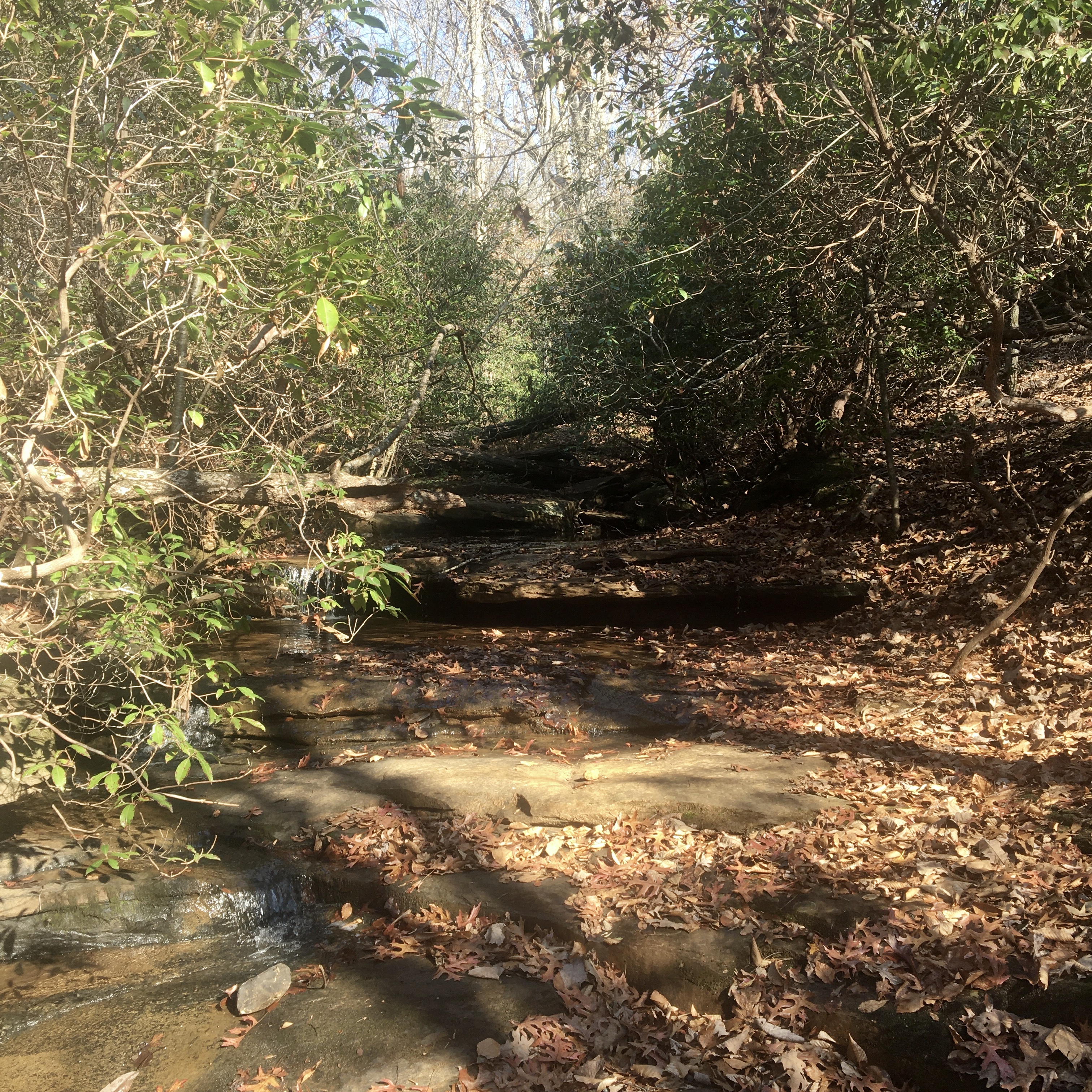 A small creeks runs between rocks and mountain laurel. There are many fallen leaves and small patch of clear sky. It is winter, and shadows are long.