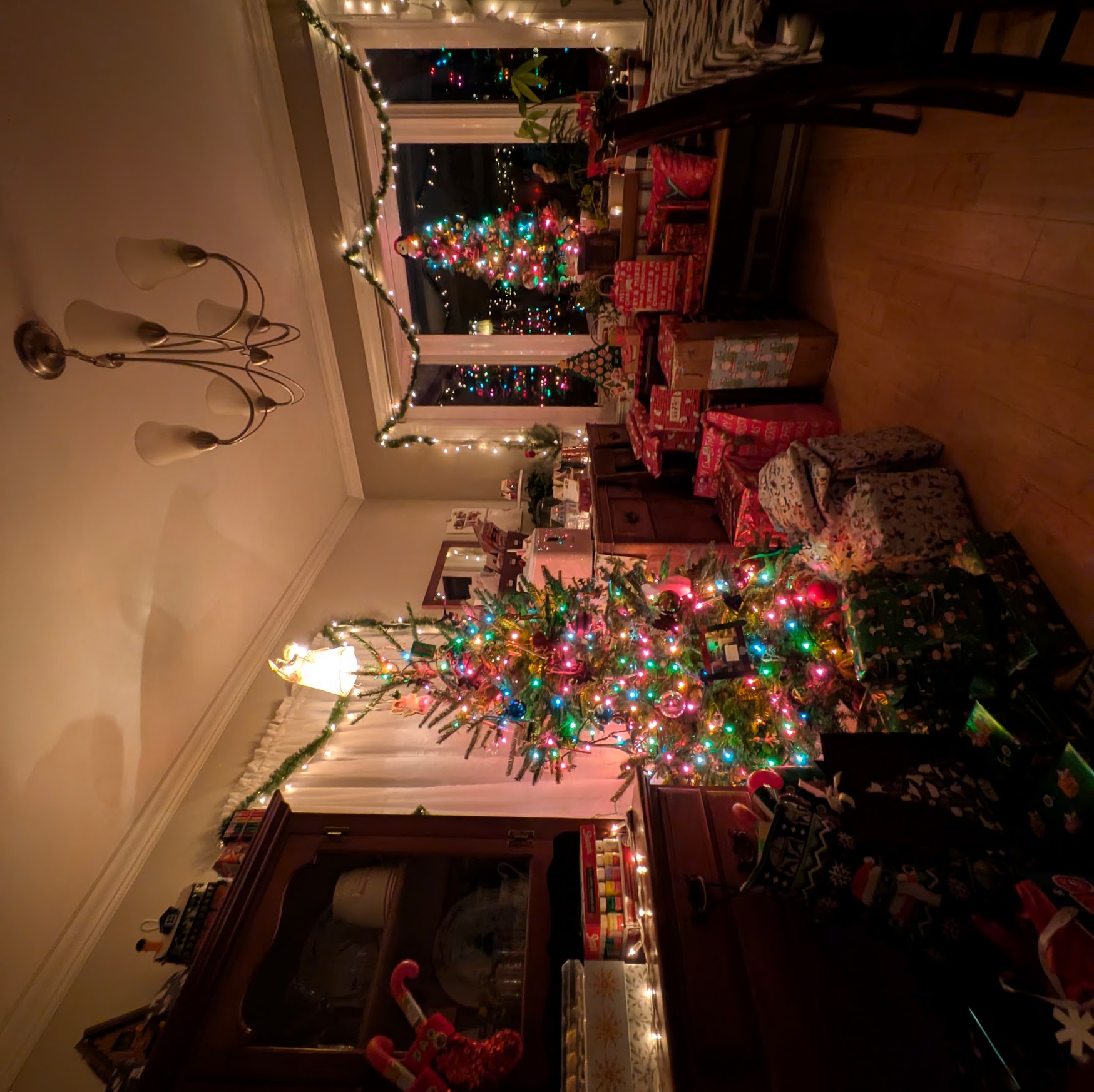 a dark dining room set a glow by xmas lights, there are presents scattered around the floor, a small real and somewhat asymmetrical christmas tree is covered in lights and ornaments with a lit angel on top, and in a back window is a tiny fake tree that also has lights, and in mltshp/mltshk tradition the photo is rotated 90 degrees to the left