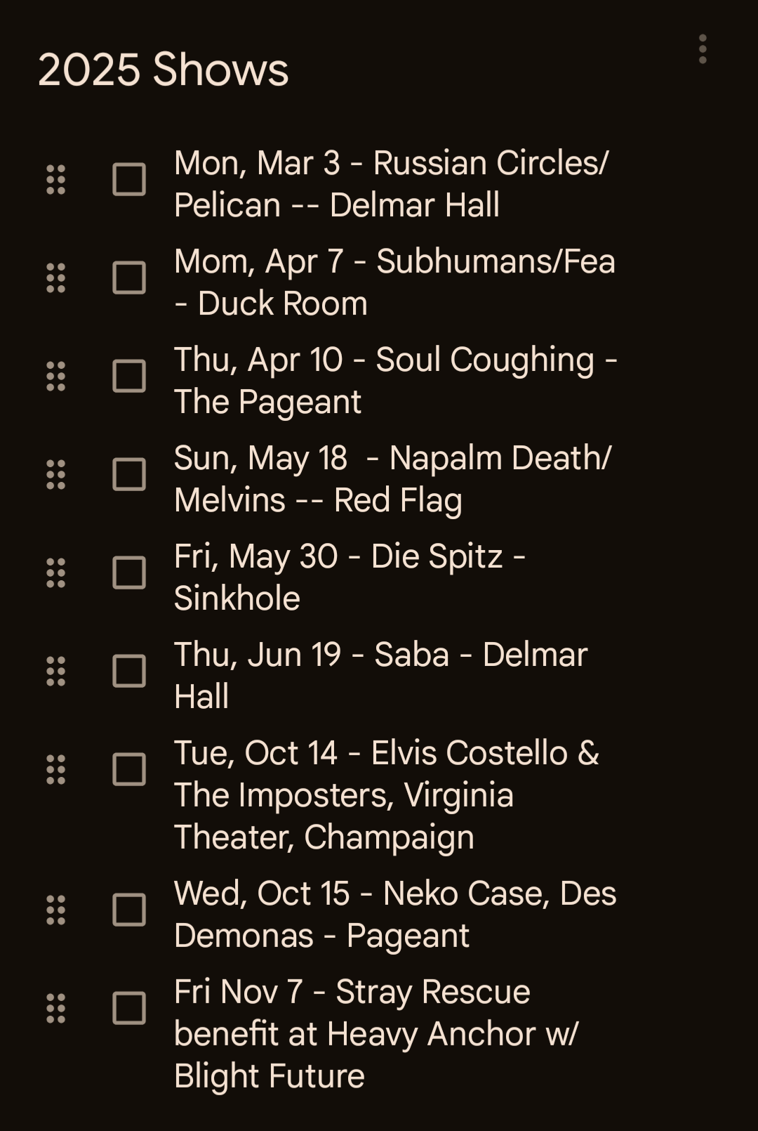 Screenshot of a Google Keep list showing the concerts I attended in 2025, including Pelican and Russian Circles, Subhumans and Fea, Soul Coughing, Napalm Death and Melvins, Die Spitz, Saba, Elvis Costello & The Imposters, Neko Case and Des Demonas, and a benefit for Stray Rescue of Saint Louis.