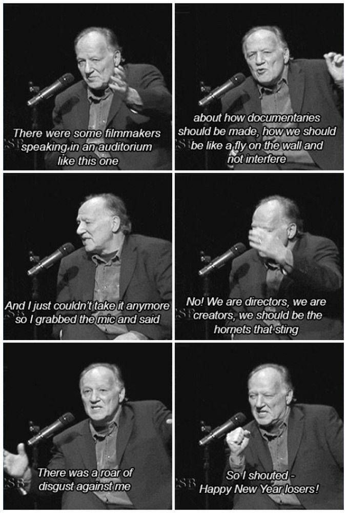 There were some filmmakers speaking in an auditorium like this one about how documentaries should be made, how we should be like a fly on the wall and not interfere. And I just couldn't take it anymore, so I grabbed the mic and said No! We are directors, we are creators, we should be the hornets that sting. There was a roar of disgust against me so I shouted—Happy New Year losers!