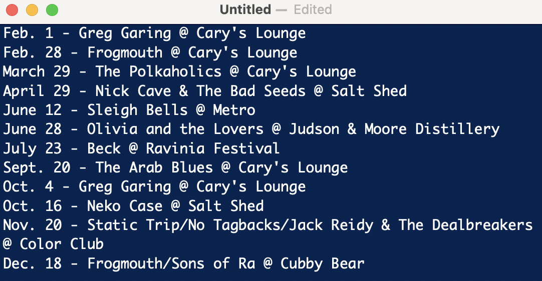 I am almost certainly missing a couple here. One of the nice things about having an excellent bar a block and a half from home that hosts free shows three nights a week is that I actually catch more live music that I would otherwise. Bear in mind, I also go to a lot of live lit/storytelling shows around town, and host two live lit shows and a variety show of my own. I also saw at least one dance performance, but I didn't record it on my calendar.