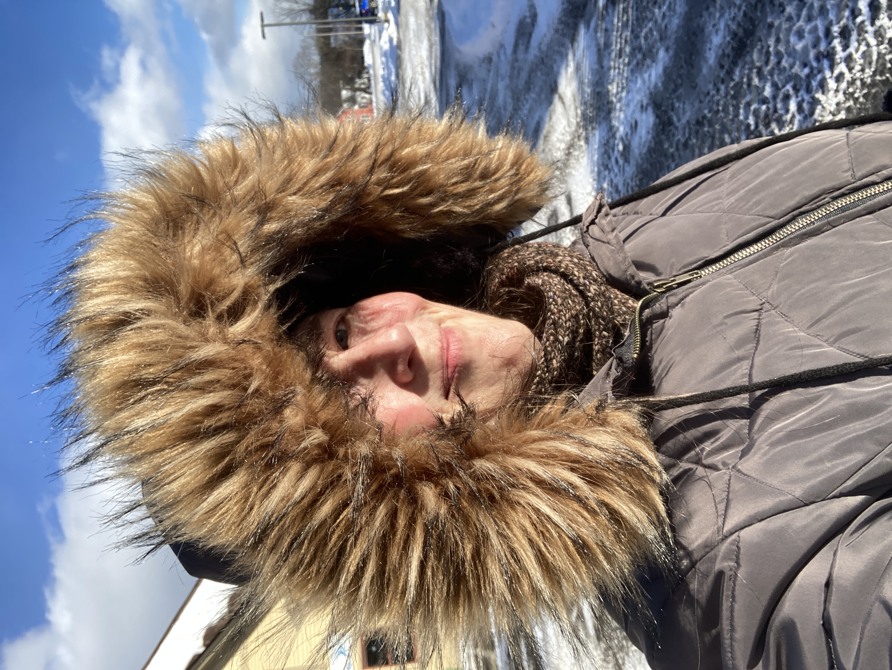 Me in a jacket with a hood pulled over my head. It has that sort of fake fur around the edges and the fake fur is being blown back. I'm wearing a brown wool scarf. I have very rosy cheeks and something approximating a smile. I am outside. It's sunny and the sky is a bright blue.