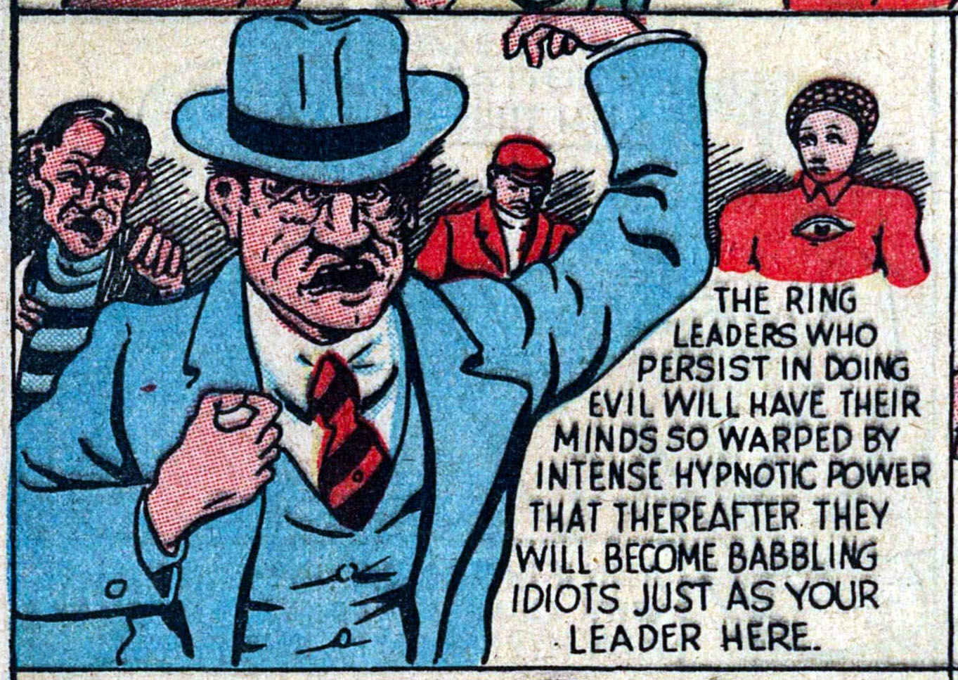 Comic panel: A man in a blue suit and red tie waves his hands around while three people in the background look on. Text in the bottom right corer reads "THE RING LEADERS WHO PERSIST IN DOING EVIL WILL HAVE THEIR MINDS SO WARPED BY INTENSE HYPNOTIC POWER THAT THEREAFTER THEY WILL BECOME BABBLING IDIOTS JUST AS YOUR LEADER HERE."