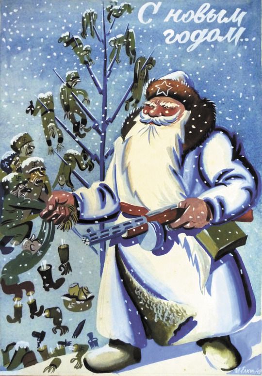 "Soviet New Year's card from the World War II showing Ded Moroz (Santa Claus) decorating his tree with Nazis, 1942"
