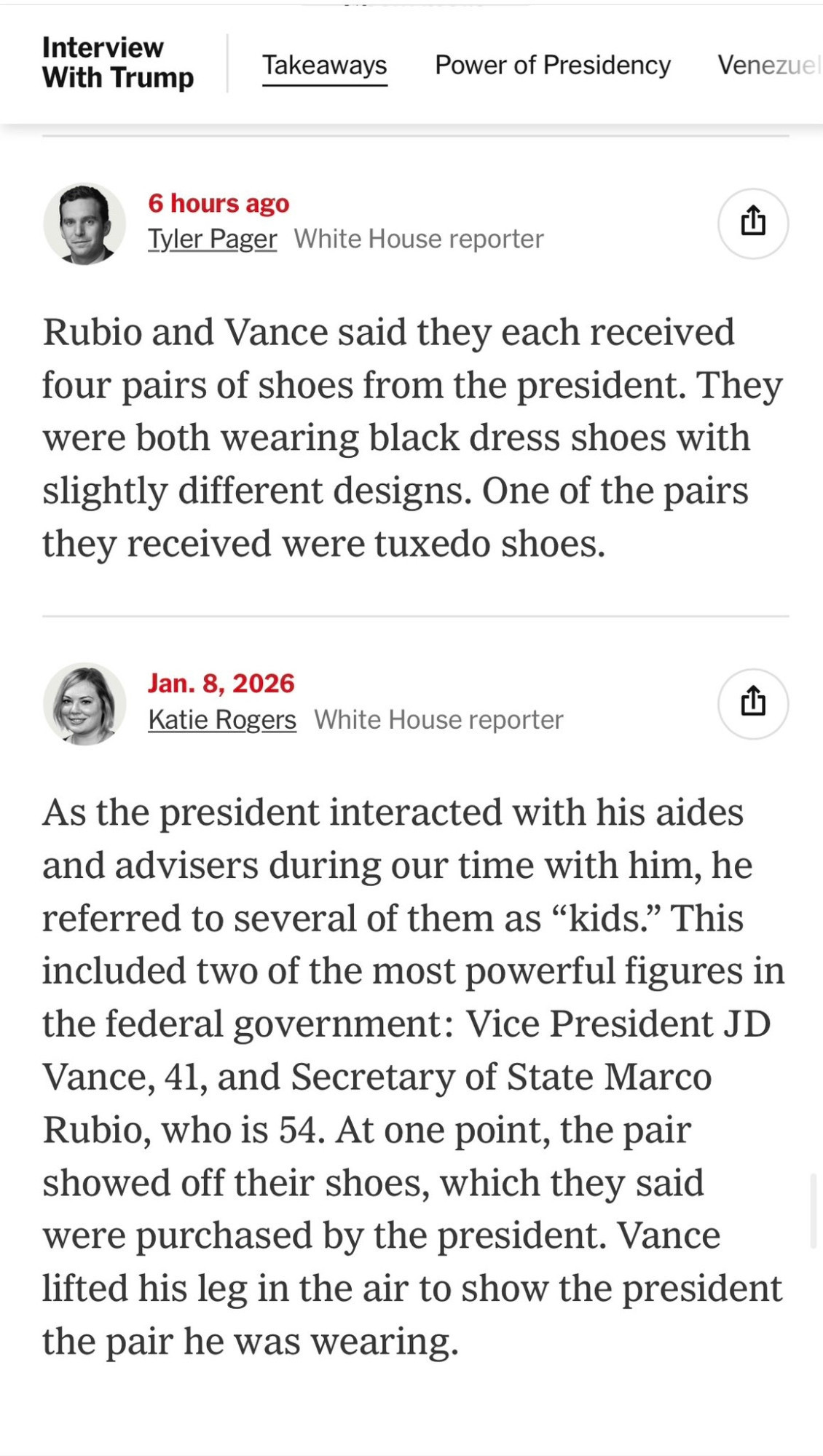 As the president interacted with his aides and advisers during our time with him, he referred to several of them as "kids." This included two of the most powerful figures in the federal government: Vice President JD Vance, 41, and Secretary of State Marco Rubio, who is 54. At one point, the pair showed off their shoes, which they said were purchased by the president. Vance lifted his leg in the air to show the president the pair he was wearing.