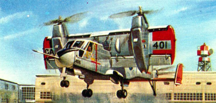 Roy Cross. Canadair CL-84 Dynavert. V/STOL turbine tiltwing monoplane. 4 built 1964 of which two static exhibits survive. From a card set called "History of Aviation," Brooke Bond, 1973.