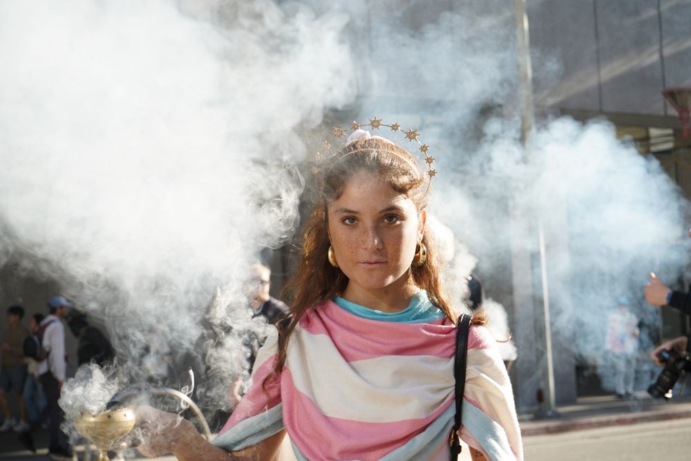 A color photograph of a young white woman with long hair, standing on a street, wearing a tiara and a shoulder bag and staring directly at the camera. She's draped in a trans pride flag. Behind her is an office building with people milling around. She's holding something that looks a bit like a crystal glass, emitting huge plumes of smoke.