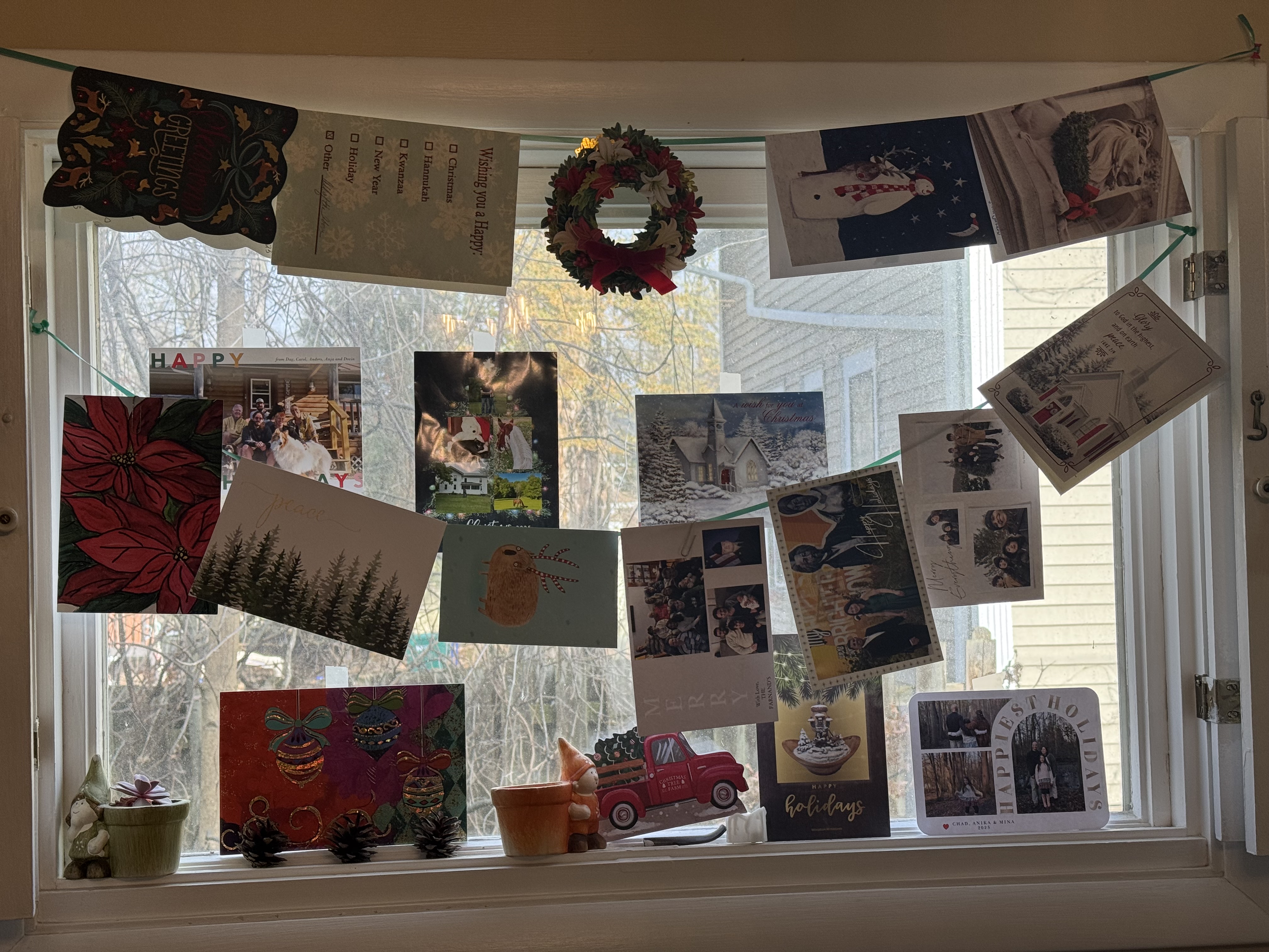 Several Holiday cards hung on ribbon or taped to glass adorn this window with unfurled (?) shutters. Also seen are two small flower pots with succulents in them.