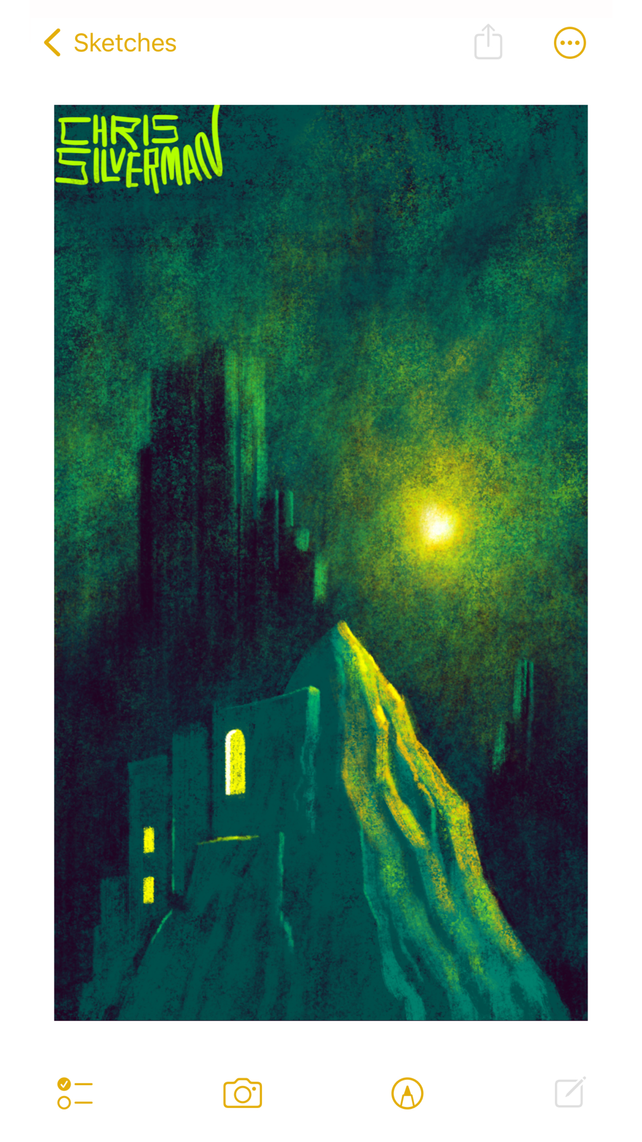 An eerie green world: a dark sky, heavy with fog, punctuated by one blazing light that does not entirely look like a celestial body. Looming up in the background are dark silhouettes that could either be skyscrapers or towers of rock. In the foreground is a smaller, lighter, conical mountain, green like everything else. Its right edge reflects yellow light from the glowing orb above it. Carved out of the side of the mountain are rough blocky shapes that suggest buildings. They have a few glowing yellow windows in them. The painting is signed "Chris Silverman".