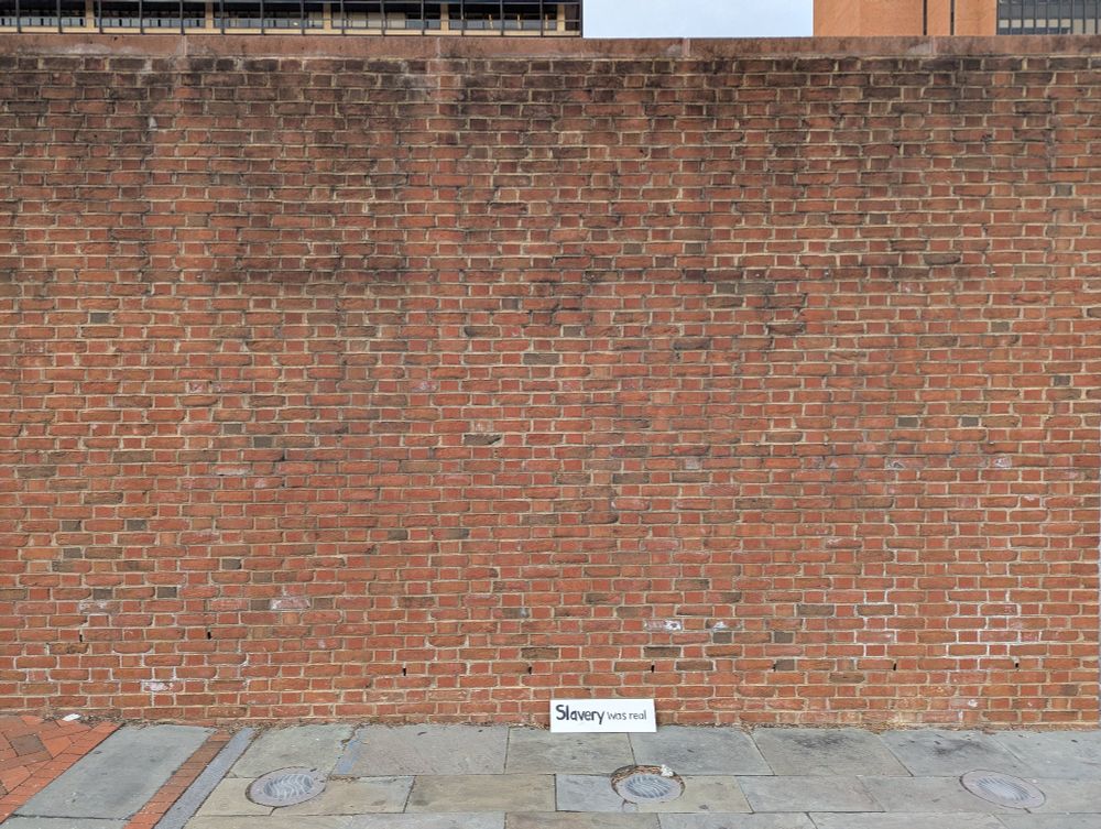 A very small handwritten sign leaning against a newly empty brick wall that just says “slavery was real”. The wall formerly held informational signs about the history of enslaved people at the President’s House in Philadelphia