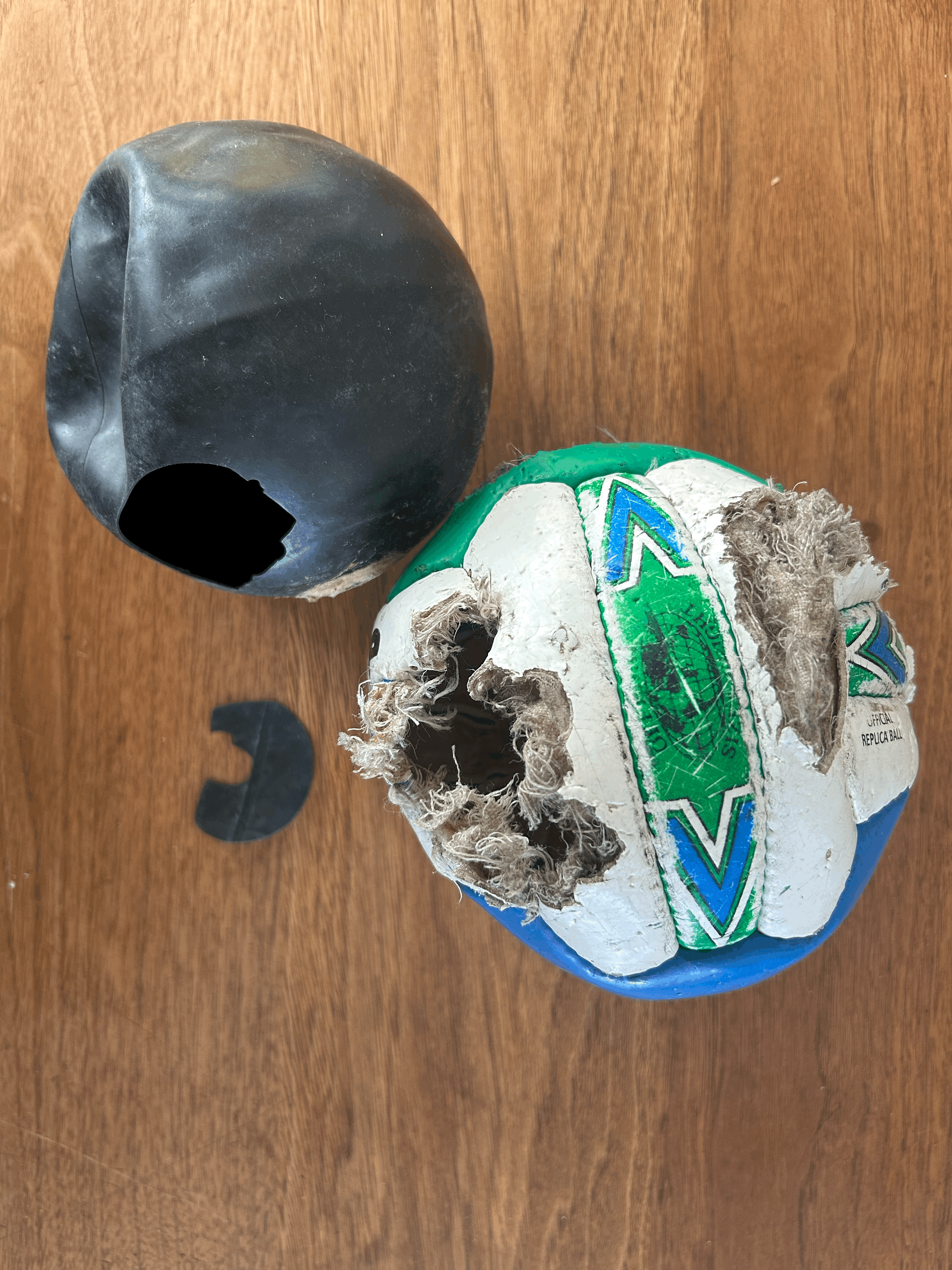 An 8-inch-diameter blue, green and white leatherette soccer ball with gaping holes torn in its exterior, beside a black rubber sphere with a hole torn in it and a shred of rubber next to it - apparently all destroyed by a wild animal - on a wooden table.