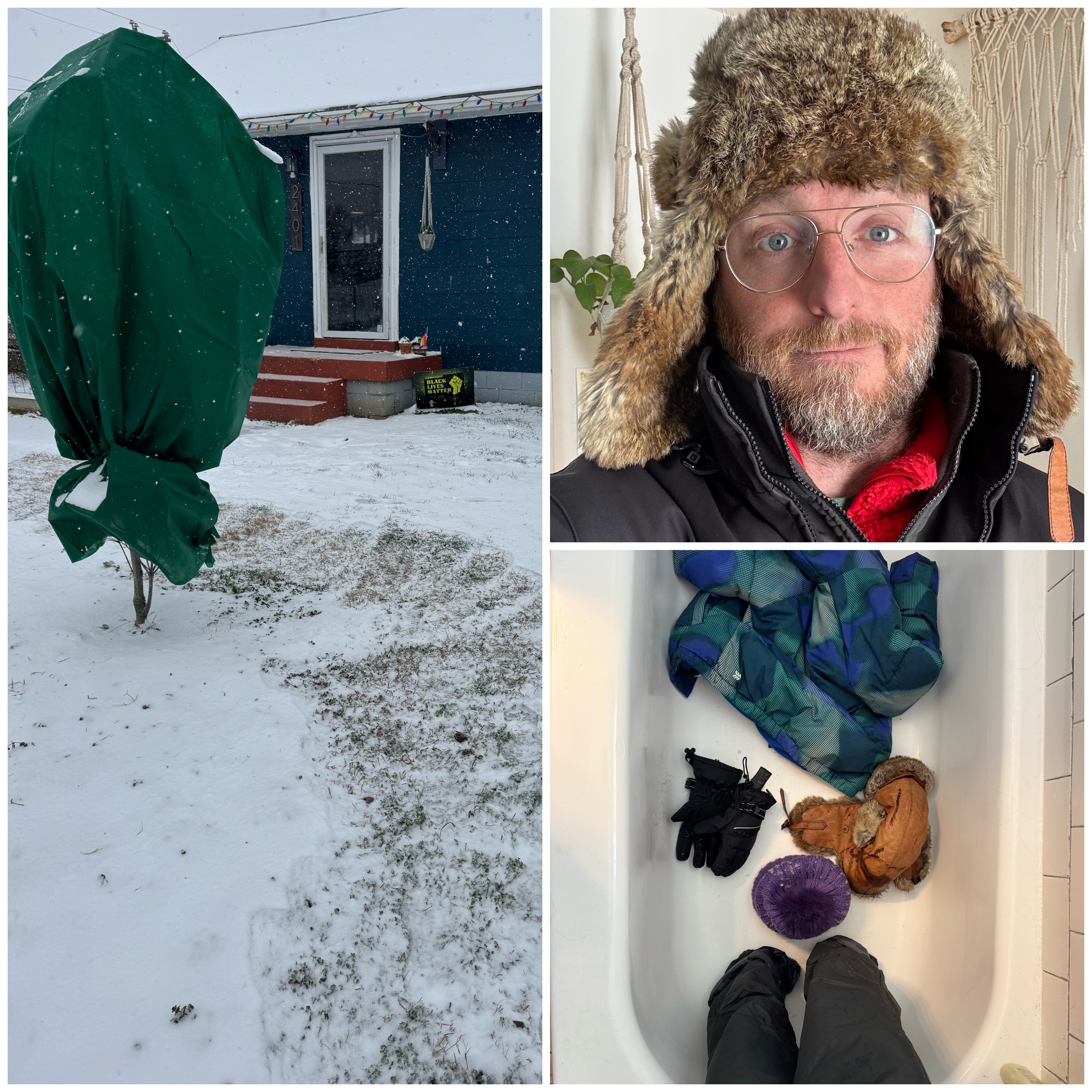 In the bottom right, outdoor clothing sits in a bathtub after getting snowy playing in it outside.