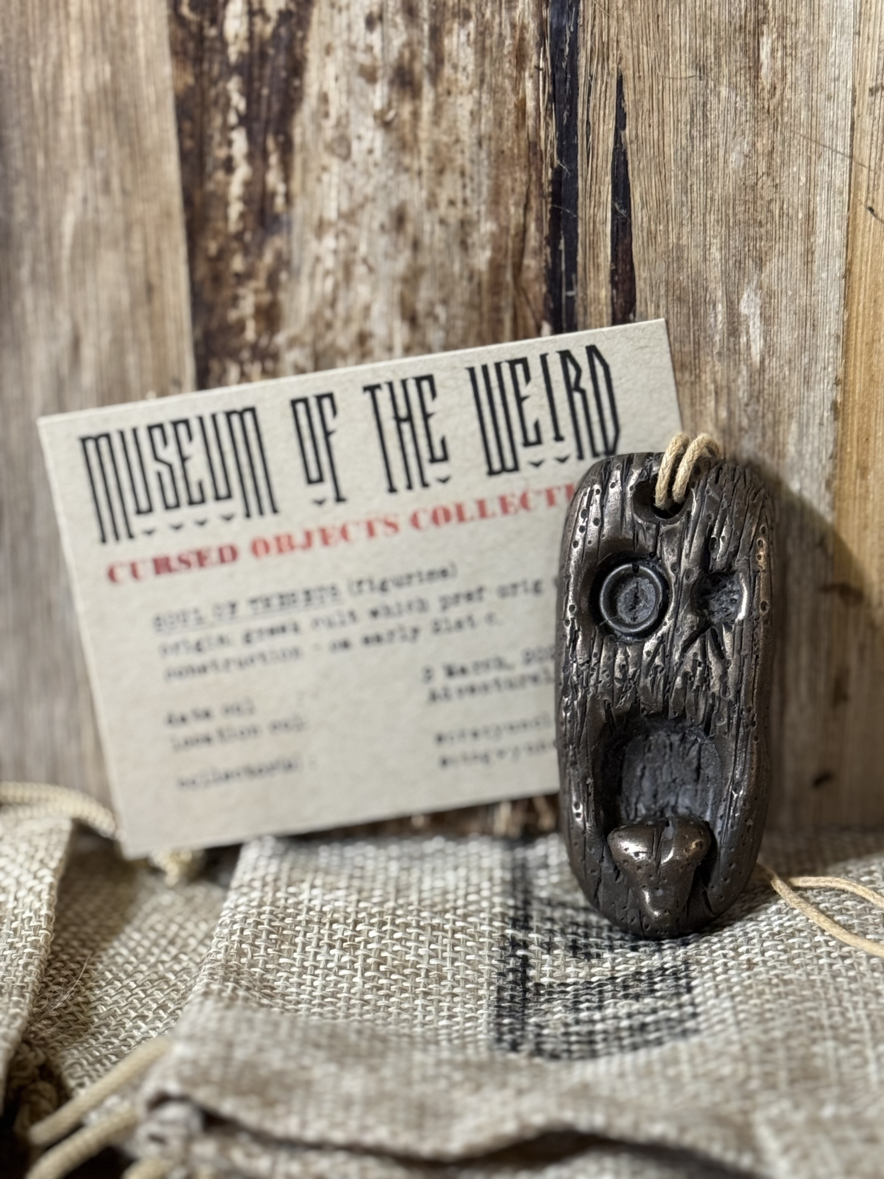 A cold cast pendant designed to look like driftwood sticking out its tongue. It has a collection card for Museum of the Weird behind it