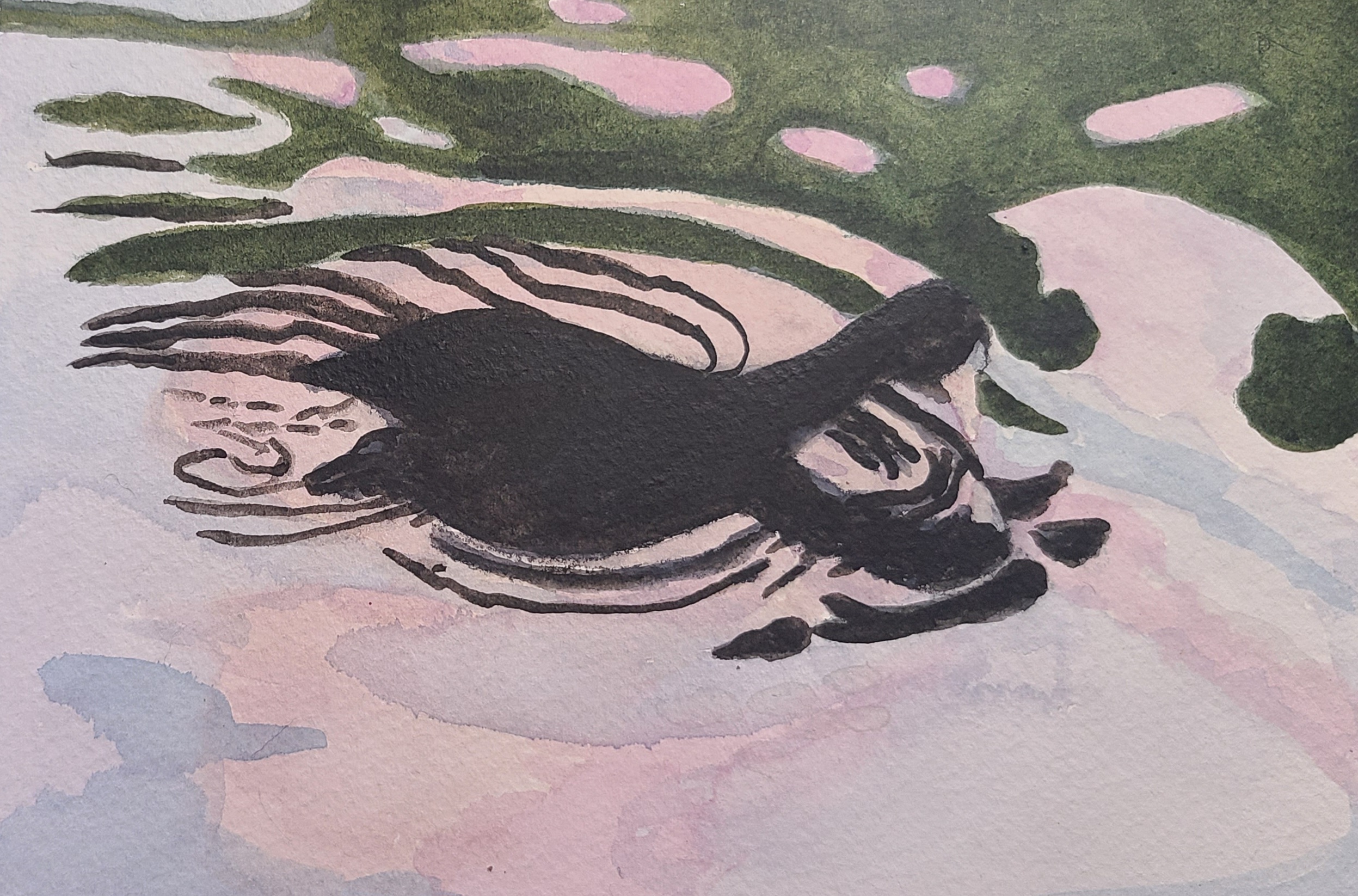 I'm going to paint this again on slightly bigger paper, with the digital image in natural light. The daylight fluorescent bulb on my desk, turned the water more pink in the phone.