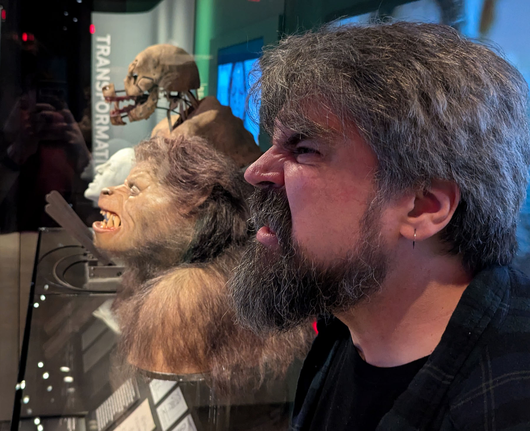 A shaggy-haired bearded guy poses beside a movie prop bust of a werewolf.